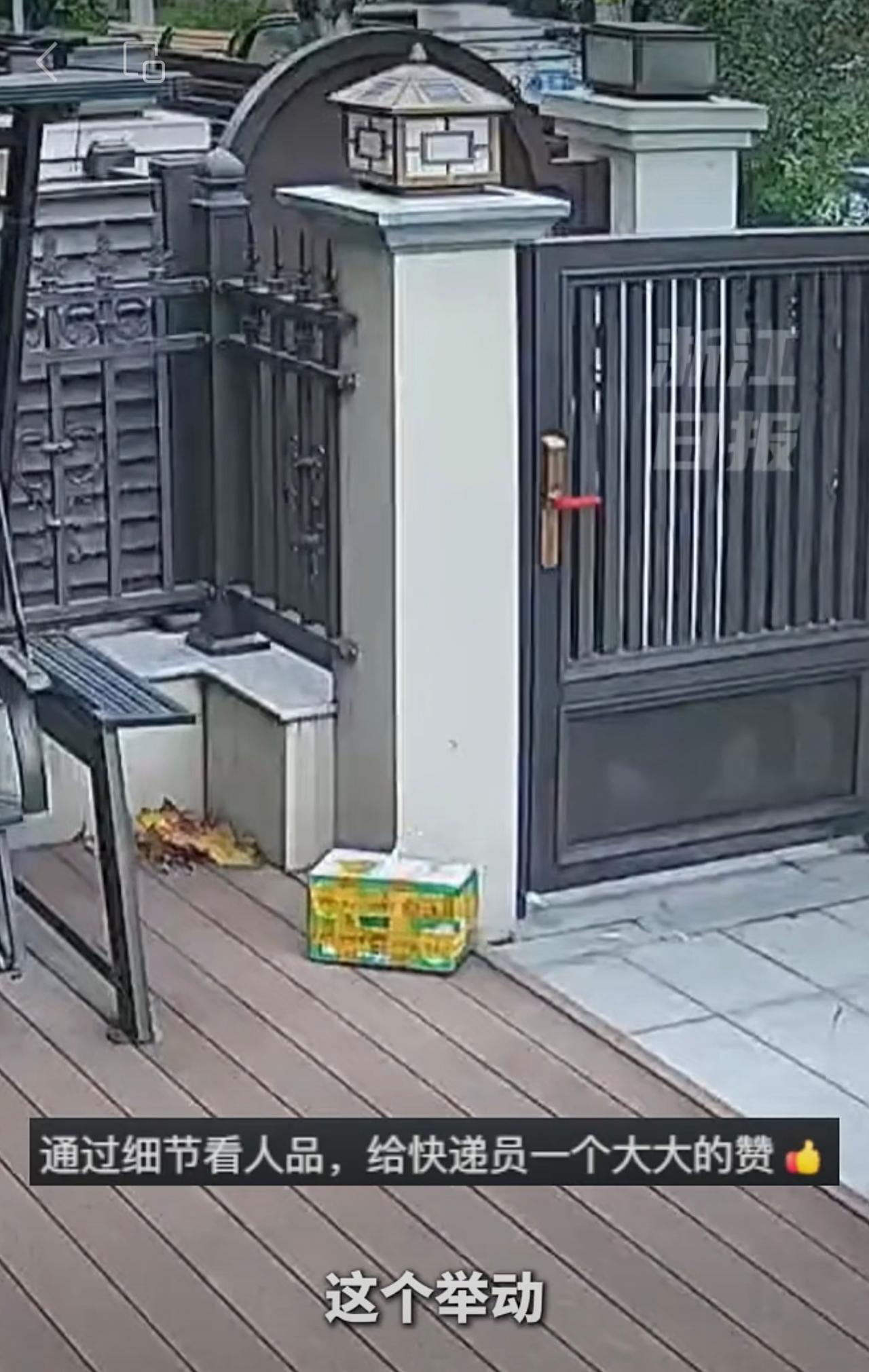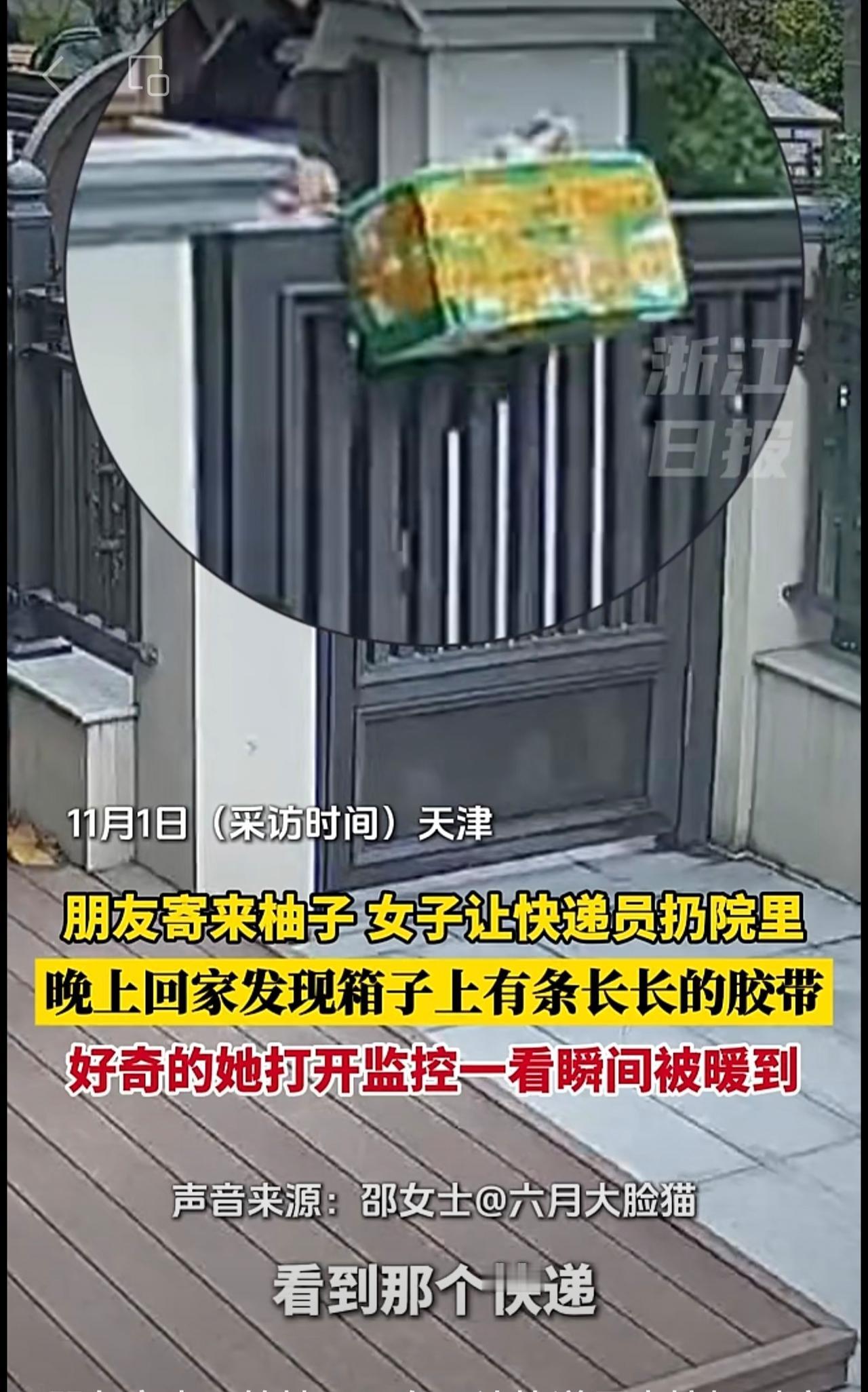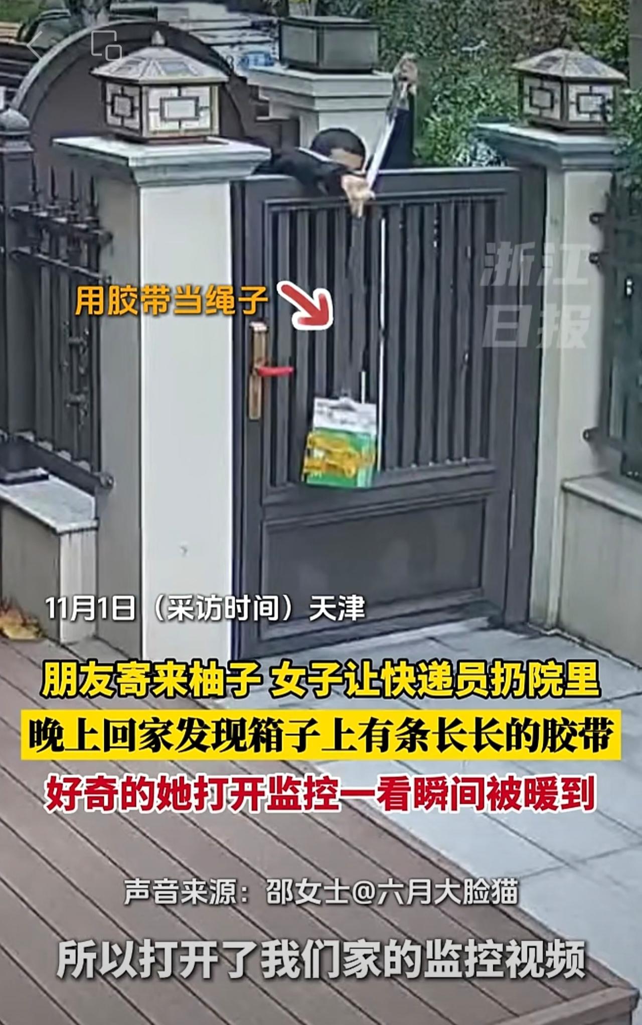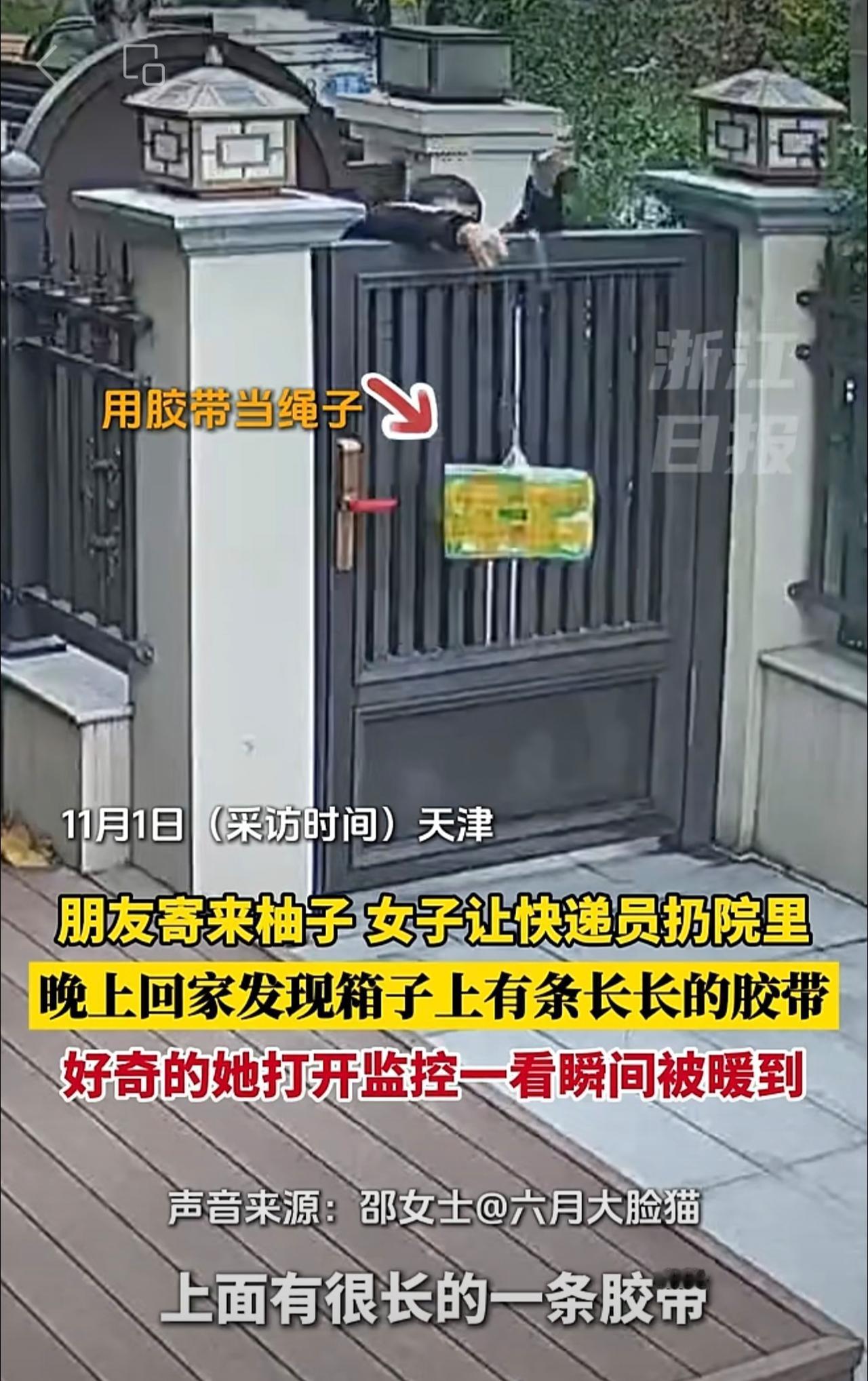 朋友寄来一箱柚子,女子让快递员直接扔到院子里就行。她晚上回家发现箱子上有条长长的胶带,好奇的她打开监控一看瞬间被暖到!(来源:浙江日报)