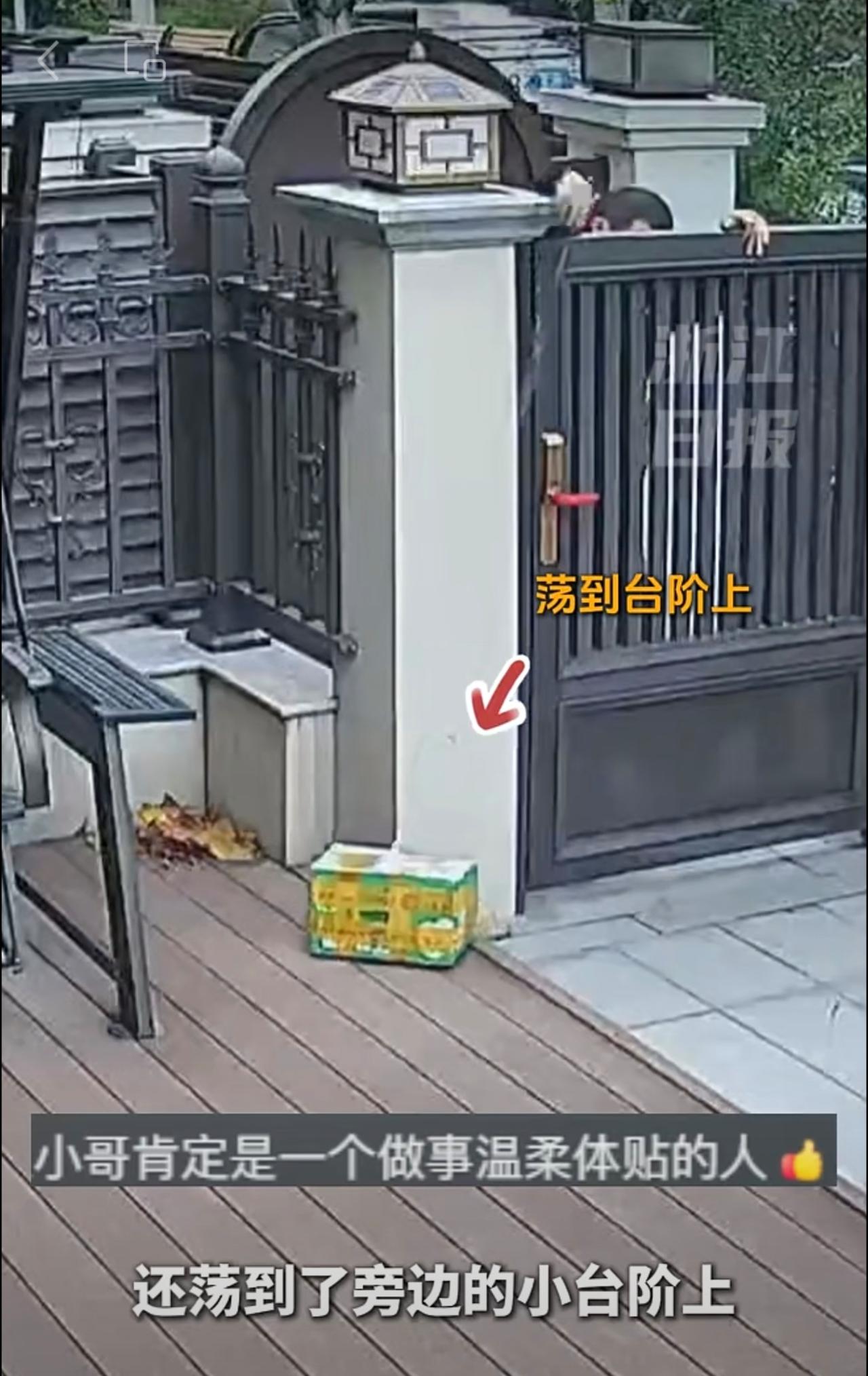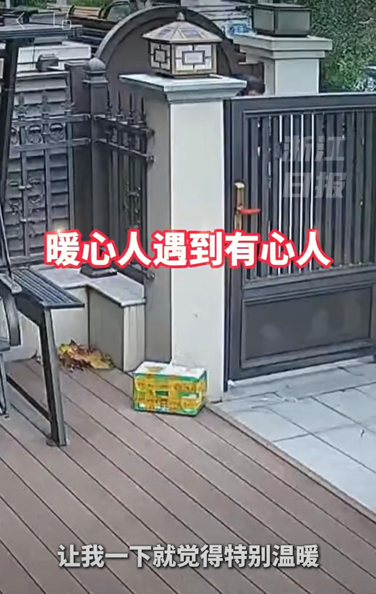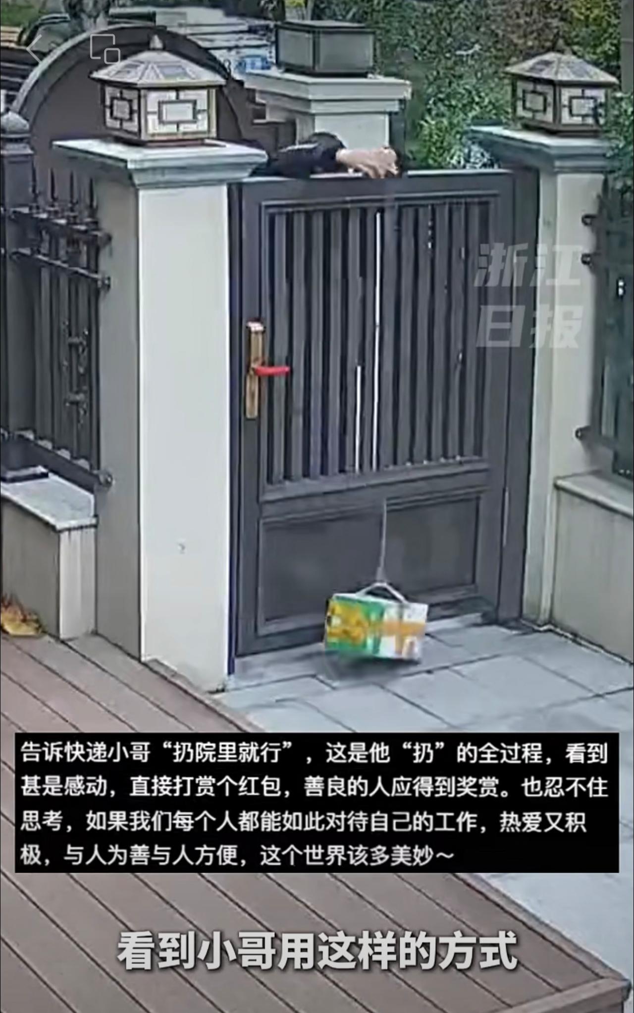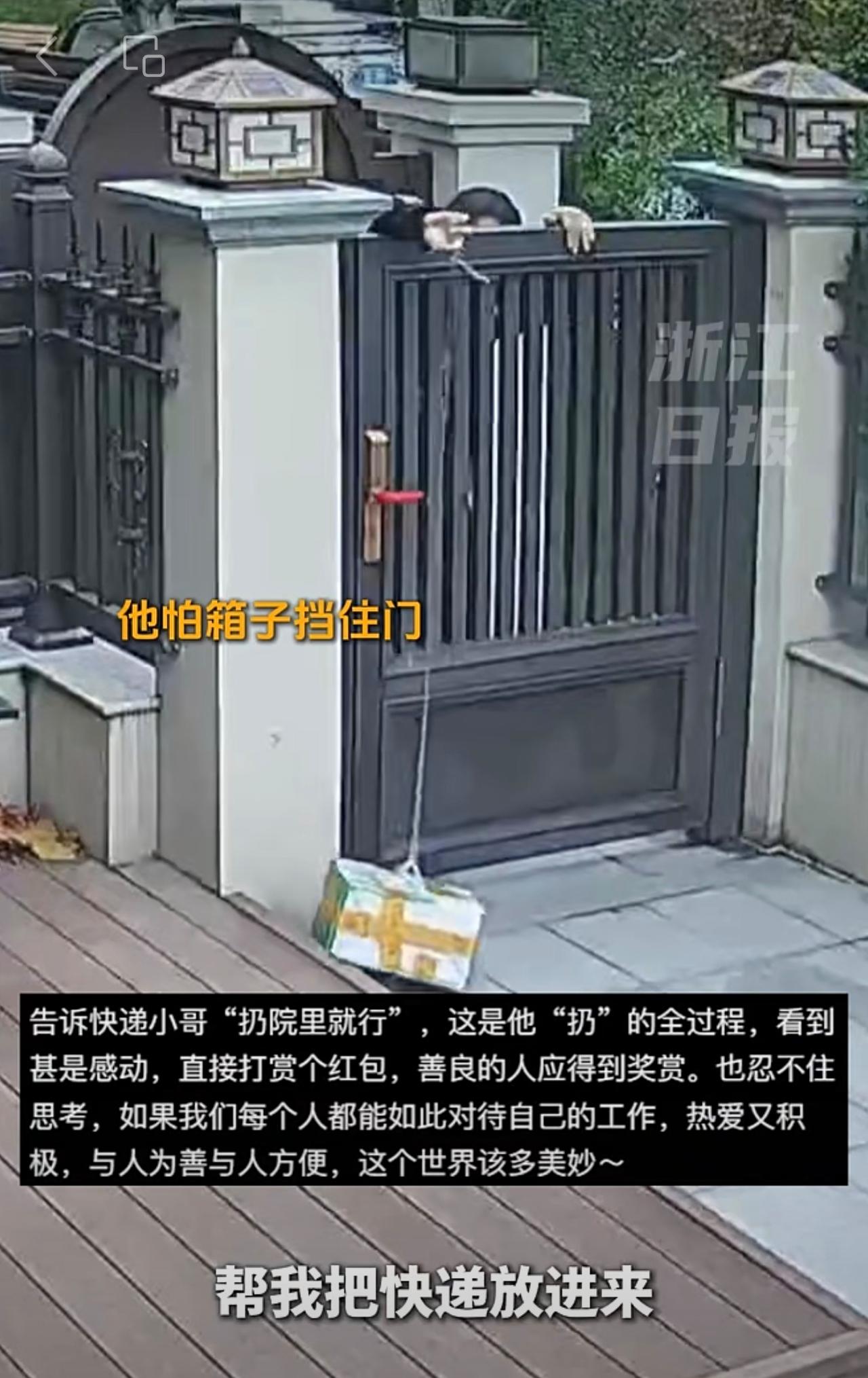 朋友寄来一箱柚子,女子让快递员直接扔到院子里就行。她晚上回家发现箱子上有条长长的胶带,好奇的她打开监控一看瞬间被暖到!(来源:浙江日报)