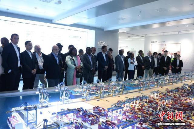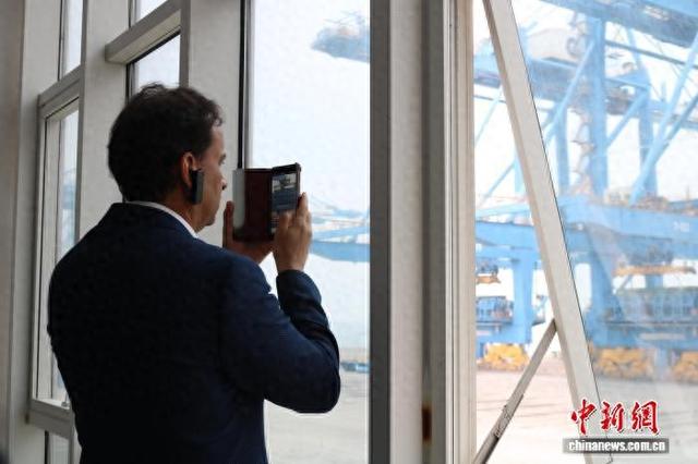 北部湾港钦州自动化集装箱码头的高效运转,让驻华大使和外交官员们纷纷举起手机拍摄。