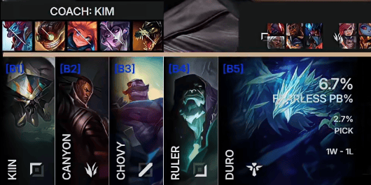GEN选用:Kiin约里克;Canyon蝎子;Chovy冰鸟;Ruler卢锡安;Duro布隆