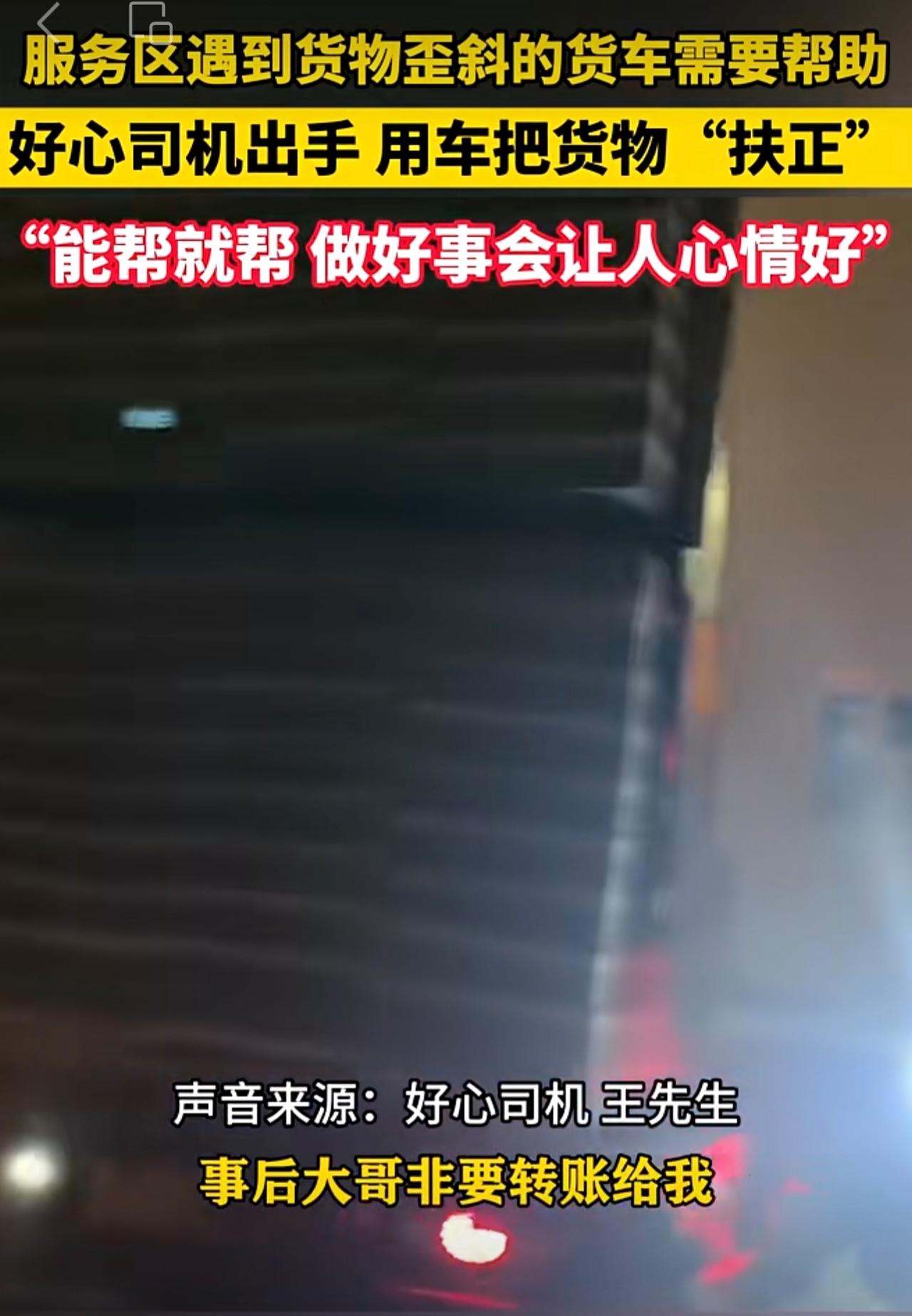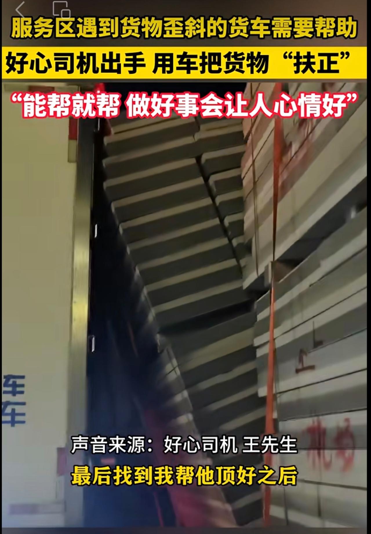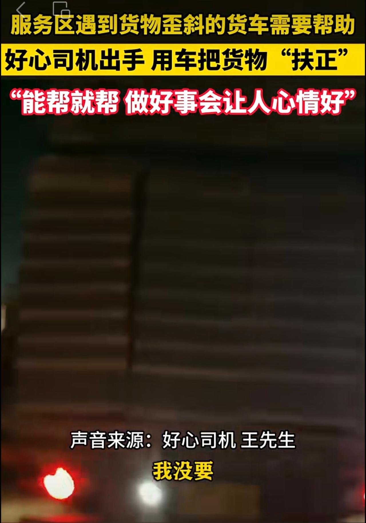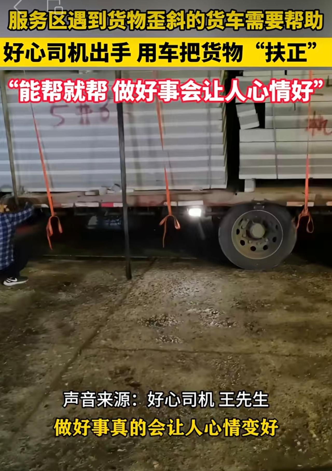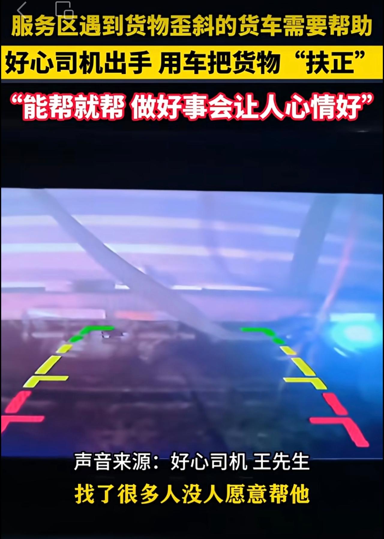 11月1日(报道)G2京沪高速。服务区遇到货物歪斜的货车需要帮助,好心司机出手,用车把货物“扶正”。“能帮就帮,做好事会让人心情好。”(来源:AHTV第一时间)