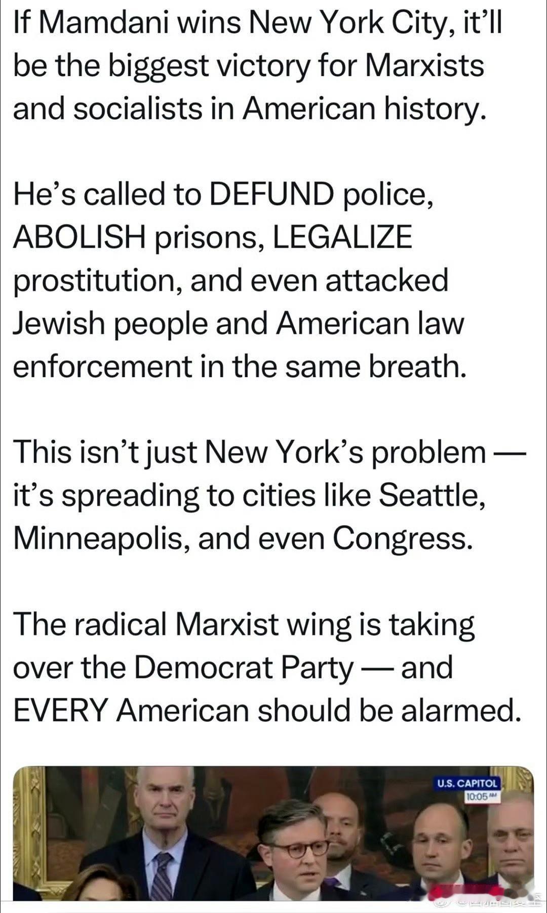 众议长约翰逊:如果Mamdani赢了纽约市长选举,将是美国历史上,马克思主义者和社会主义者取得的最大胜利…不仅是纽约,还有西雅图、明尼阿波利斯、甚至国会…极端马克思主义已经接管民主党,每个美国人都应该提高警惕 。 众议长迈克·约翰逊关于纽约市长选举的言论,反映了美国国内政治中一些深刻的矛盾和日益激烈的意识形态斗争。 民主党的初选结果民调结果显示,纽约州众议员佐赫兰·马姆达尼(Zohran Mamdani)确实领先,有望成为纽约市长。他自称是 “民主派社会主义者” ,其竞选纲领主要关注降低纽约市民的生活成本,这为他吸引了大量年轻和少数族裔选民的支持。 众议长约翰逊对马姆达尼可能当选纽约市长的警告,主要应被视为国内政治斗争和政治动员的一部分。马姆达尼的政策主张更贴近民主社会主义的范畴,关注社会公平和民生问题。他的崛起,以及此前桑德斯现象,都表明在当代美国,对现有经济政治结构进行更深刻改革的声音确实在获得一定的共鸣。然而,这些主张能否在主流政治中取得更大突破,仍面临美国现有政治结构和意识形态的严峻挑战。即使马姆达尼赢得纽约市长选举,也不可能改变美国的政治架构和意识形态格局。约翰逊俄警告性言论,其实是还是出于党争需要。