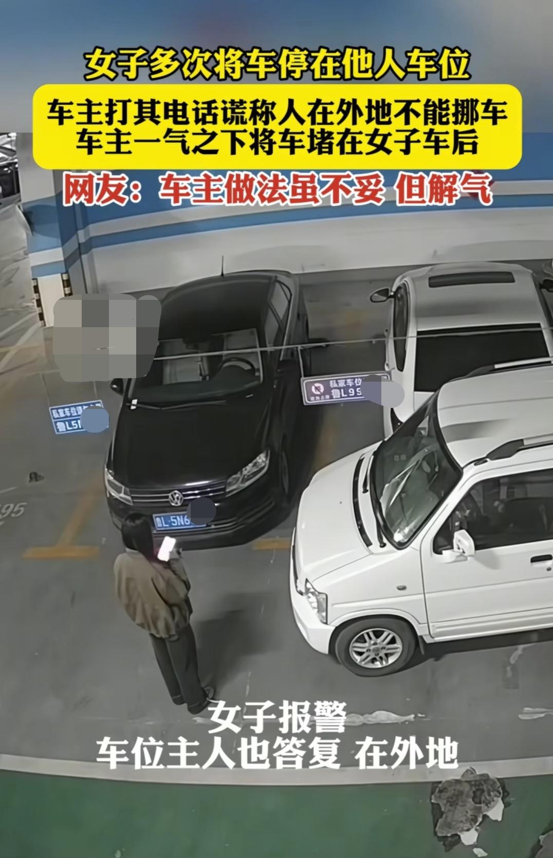 山东日照。女子多次占用他人车位,打电话也拒绝挪车,谎称自己在外地! 车位主人一气之下直接用车堵住,车位主人也不挪车,女子报警,车位主人也答复:在外地! 连堵三天,女子崩溃,无奈找人帮忙才把车开走! 评论区有网友说了一件类似的事情,说发生在河北石家庄恒大雅苑的: 车位主人选择报警,物业锁车,派出所罚款了六千多。个人觉得就应该对这种占人家车位,喜欢占人家便宜人进行重罚,不然他们永远不长记性的! 网友们,你们觉得呢?
