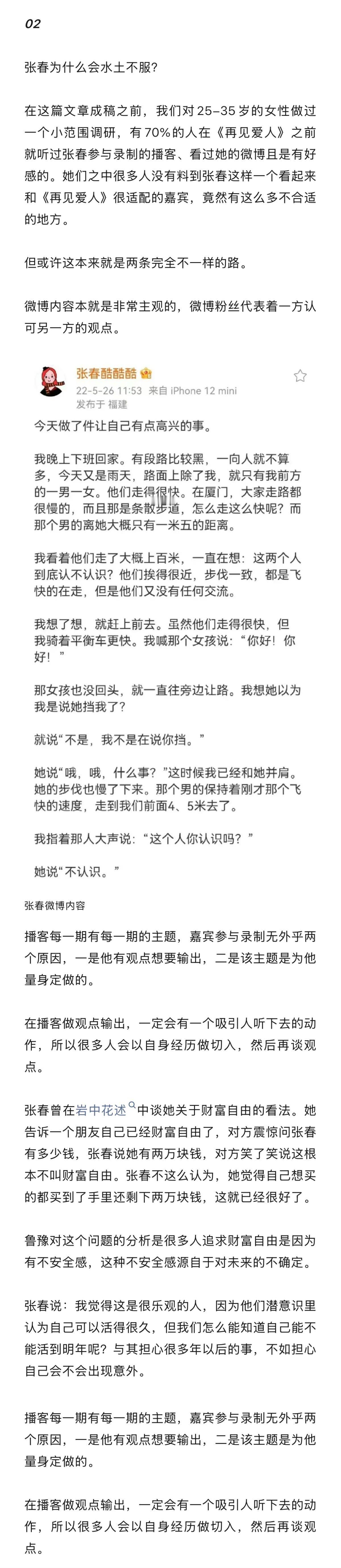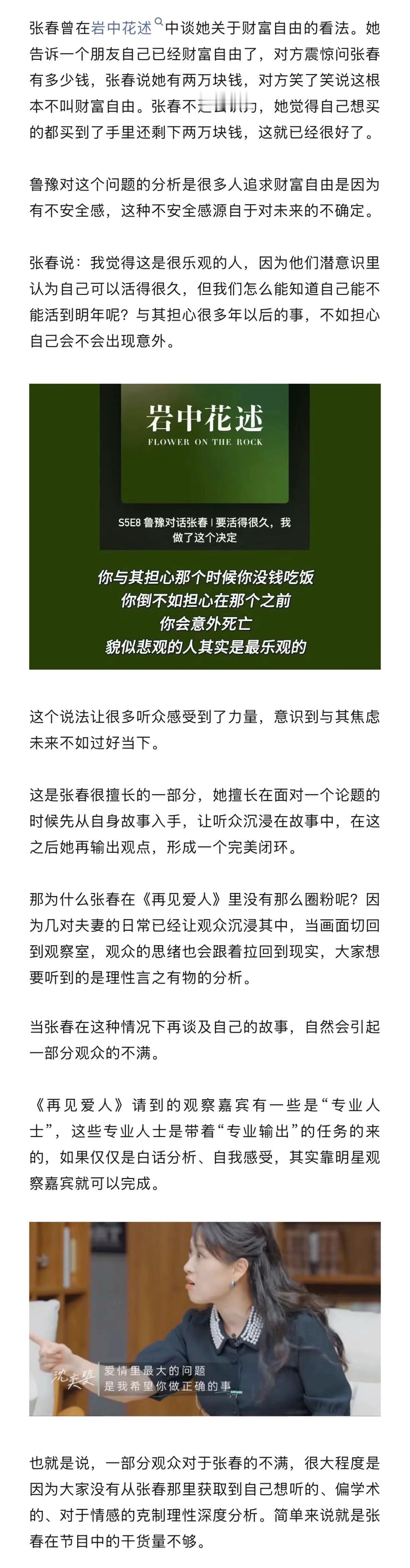 为什么张春在再见爱人水土不服 什么样的观察嘉宾适合再见爱人 播客里的故事大王,为何到了观察室就失灵?张春在《再见爱人5》里的“水土不服”,是否是对节目的定位误读?观众看真人秀时已足够沉浸,切回观察室,或许更需要精准剖析、专业解读与理性升华,张春口中的“与黄毛恋爱”似乎成了不合时宜的个人叙事。婚姻里除原则问题本无绝对对错,观察嘉宾的价值应该是带观众穿过情绪迷雾,找到理性答案。
