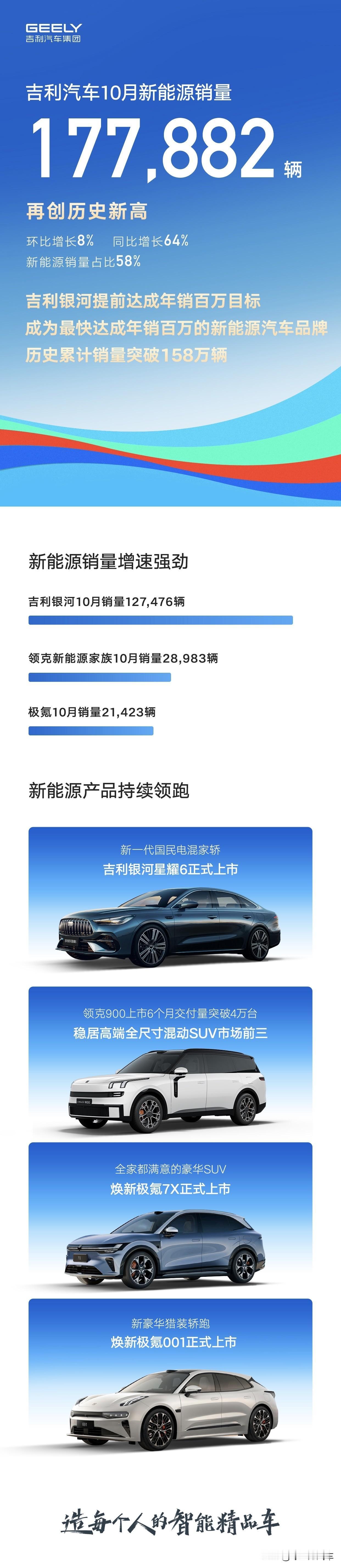 再创历史新高,吉利汽车10月销量超30万辆! 牛逼的是,吉利银河提前达成年销百万目标,10月款款车型月销过万,能干掉迪子的也只有吉利了![允悲]