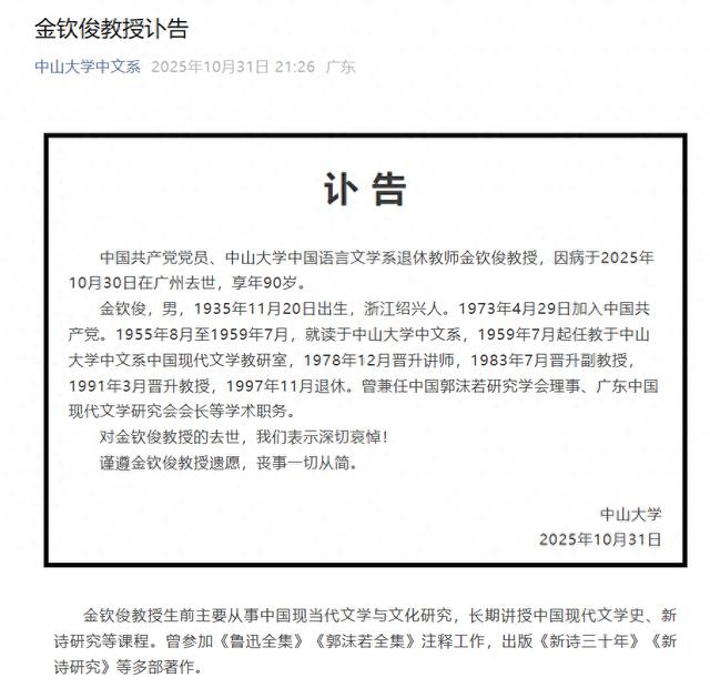 中山大学发布讣告称,金钦俊,男,1935年11月20日出生,浙江绍兴人。1955年8月至1959年7月,就读于中山大学中文系,1959年7月起任教于中山大学中文系中国现代文学教研室,1991年3月晋升教授,1997年11月退休。曾兼任中国郭沫若研究学会理事、广东中国现代文学研究会会长等学术职务。
