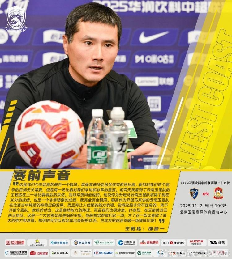 直播吧11月1日讯中超第29轮,青岛西海岸将在客场挑战云南玉昆。赛前,西海岸主帅邵佳一和球员高迪接受了采访。