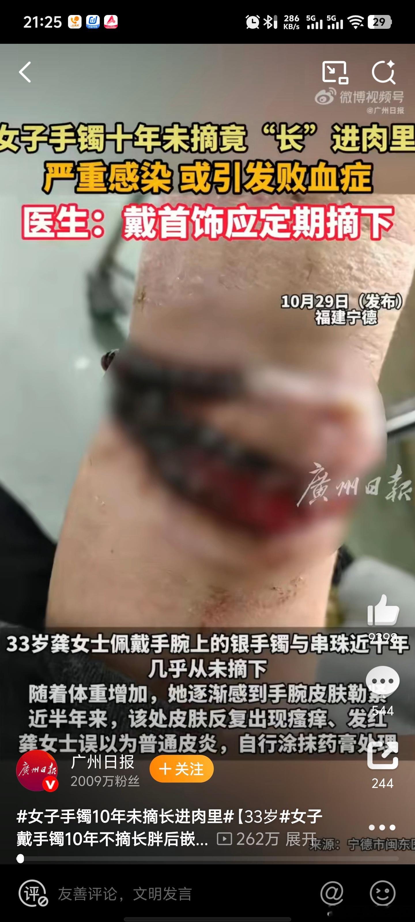 女子手镯10年未摘长进肉里稍微有点紧时候不懂得拿掉吗[允悲]怎么能忍到这程度!