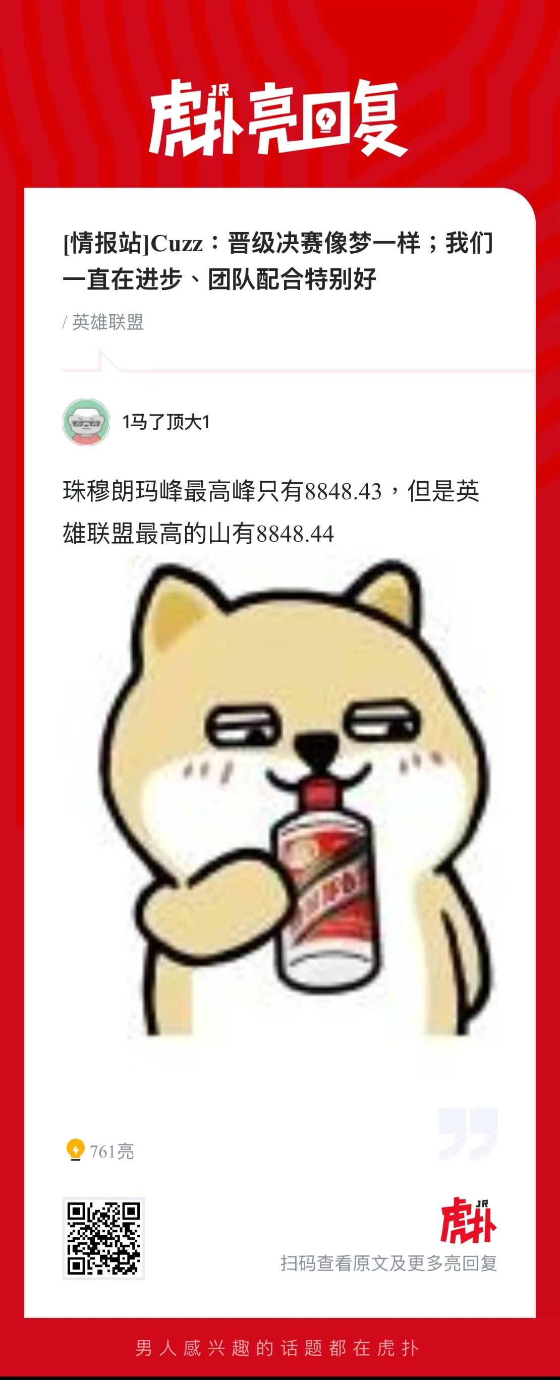 “英雄联盟最高的山来了,珠峰8848.43,超威8848.44。”