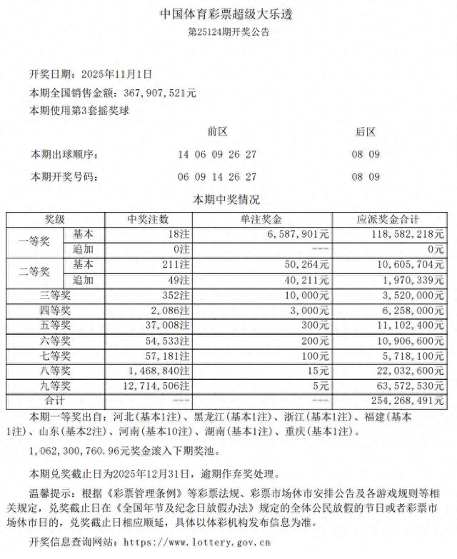 大皖新闻讯11月1日晚,中国体育彩票超级大乐透第25124期开奖公告发布。当期开出18注一等奖。