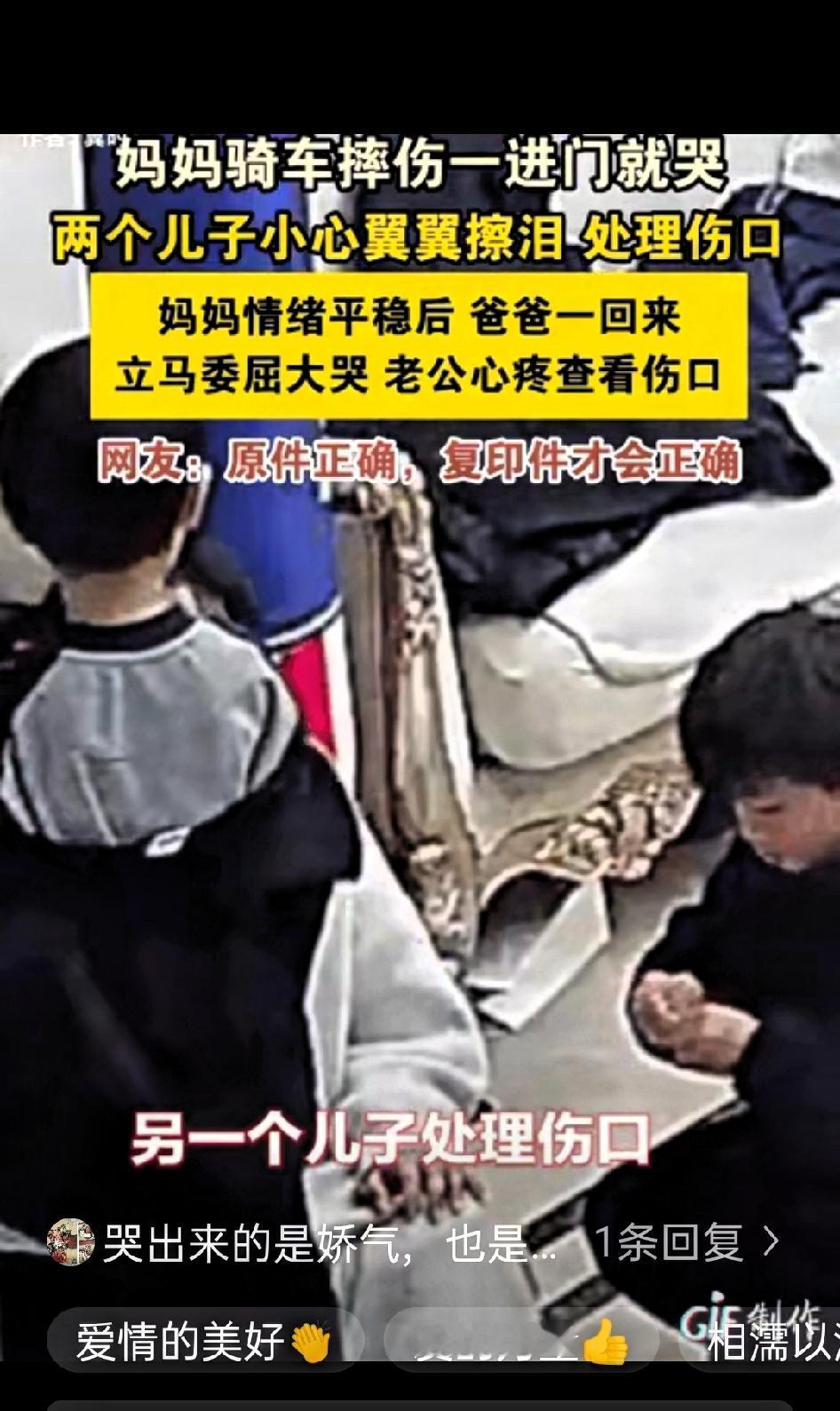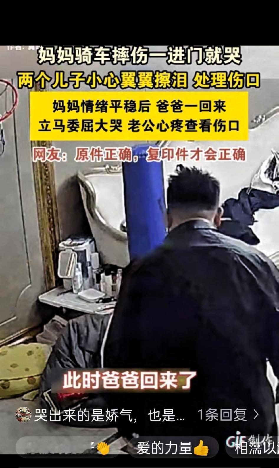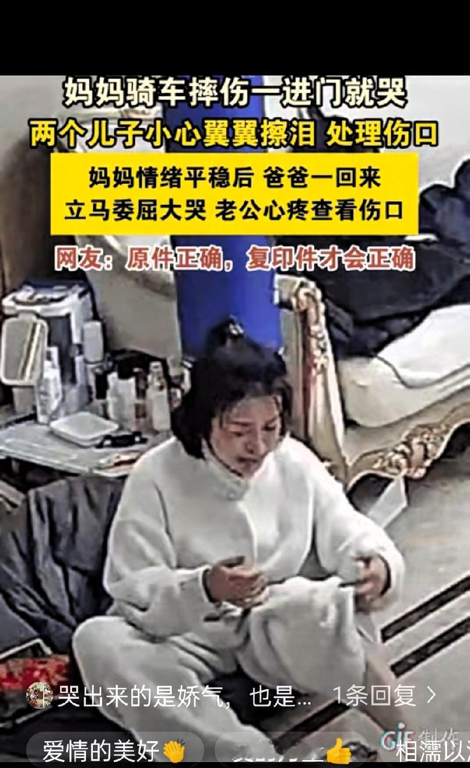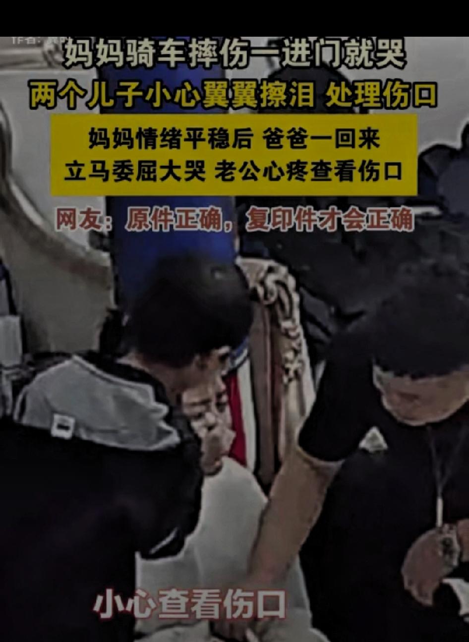 她估计是全网最幸福的女人! 浙江,女子在外骑车摔破了手脚,刚回到家就放声大哭。 傍晚骑共享单车接小儿子,路上急刹打滑,连人带车摔在地上,手掌、脚踝蹭得血肉模糊,疼得她直冒冷汗。可一想到校门口等着的孩子,她硬是咬着牙爬起来,扶着车把疼得龇牙咧嘴,还是把娃接回了家。 刚推开家门,那股硬撑的劲儿瞬间崩了。积攒一路的疼和委屈,全变成止不住的哭声,哭得像个受了委屈的小姑娘。客厅里的俩小学儿子先是一愣,凑过来看清妈妈的伤口,立马就慌了,转身就忙开了。 大儿子跑回房间翻出碘伏棉签,蹲在妈妈脚边,小心翼翼地擦伤口,动作轻得生怕碰疼她,还时不时吹一吹;小儿子攥着自己的小毛巾,踮着脚尖帮妈妈擦眼泪,奶声奶气地哄:“妈妈不哭,弟弟陪着你。” 孩子爸爸更没得说,刚听说老婆摔了,手头的活扔下一溜烟往家赶。一进门看到老婆红肿的伤口,啥也没说,蹲下来就捧着她的手轻轻吹,眼里的心疼都要溢出来。本来快哭停的妈妈,一看老公这模样,委屈劲儿又上来了,抱着他又哭了一通。 有人说她娇气,摔一下哭好几次。可我觉得,这哪是娇气?这是被爱喂出来的底气!小时候有爸妈疼,结婚了有老公宠,现在儿子成了小靠山,她才敢不用装坚强,疼了就哭,委屈了就撒娇。 其实家里最珍贵的,从不是房子车子,而是爸爸护着妈妈,孩子学着心疼人。这样的家,就算日子平平淡淡,也暖得让人眼红! 你们家娃在你难受伤心时,有没有做过什么让你瞬间鼻酸、心窝子发烫的事?