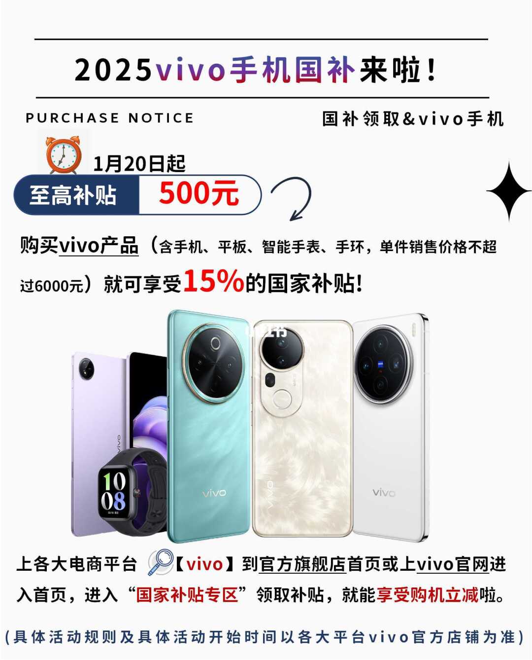 vivo官方整大活了!⏰1月20号起线上国补来袭,这个时间有宝子想入手vivo手机📱的话真的巨划算!vivo全系6000以下的产品都有15%的补贴,坠高能补贴到500元[哇R]