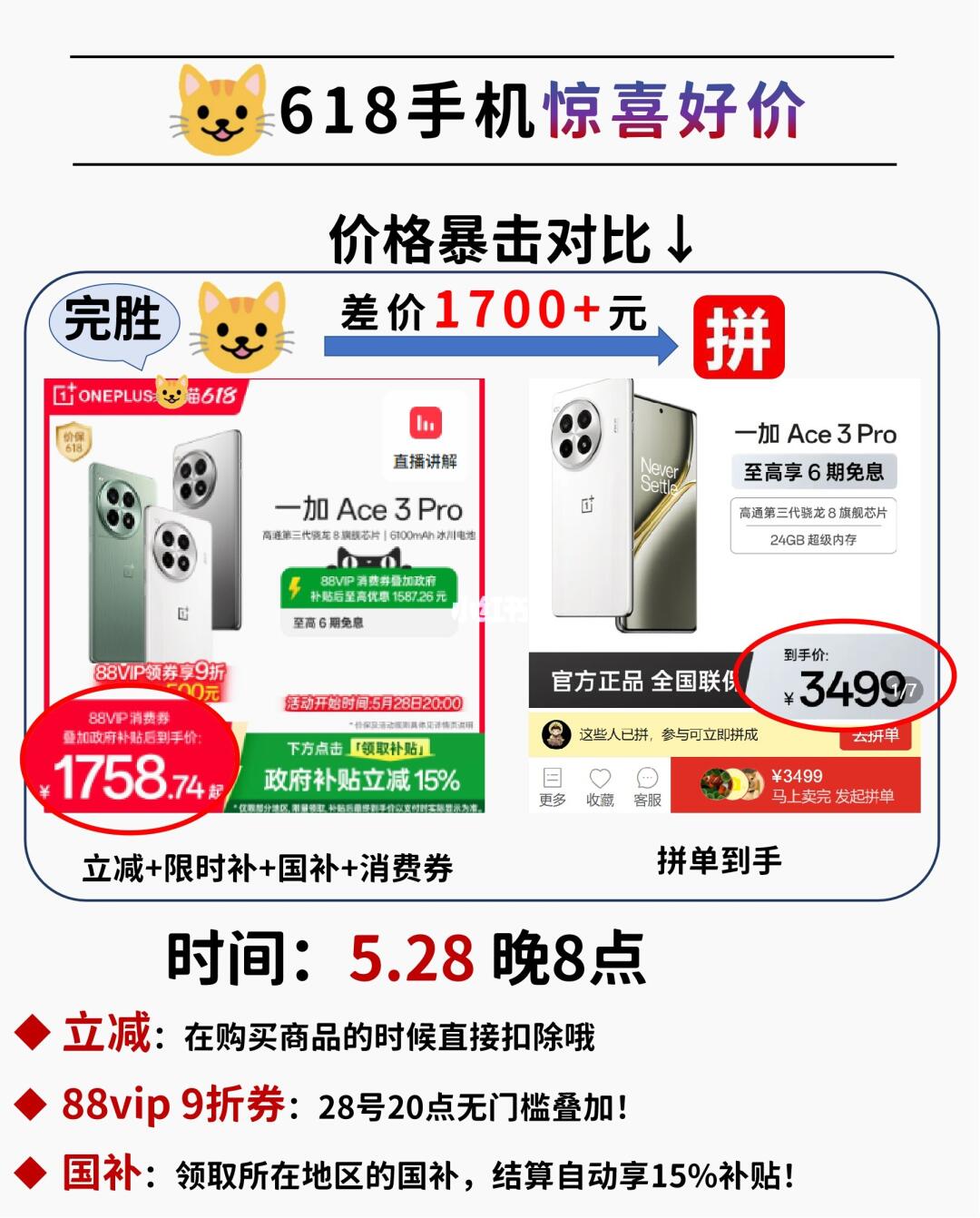 可以看到,光是一加Ace 3Pro手机在两个平台差价就挺大的了,🐱立减+限时补+国补+消费⭕️就比纯拼单入手省下1700+!这波🐱简直就是完胜啊!