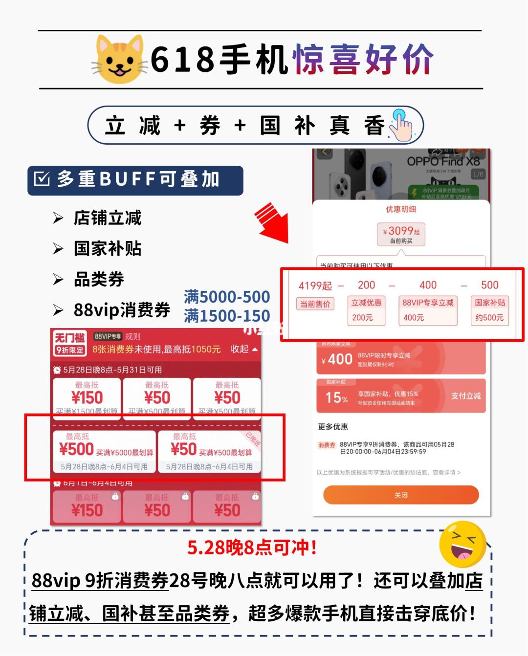 天🐱这波操作简直香疯了!四重折扣连环暴击,立减+国补+88VIP 9折⭕️+品类⭕️折上折,价格直接腰斩到脚底板!iPhone、华为、OPPO等等全线暴降,一台便宜大几千!!!