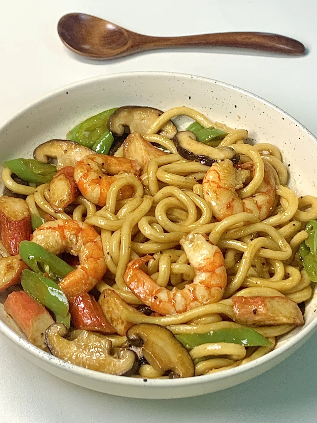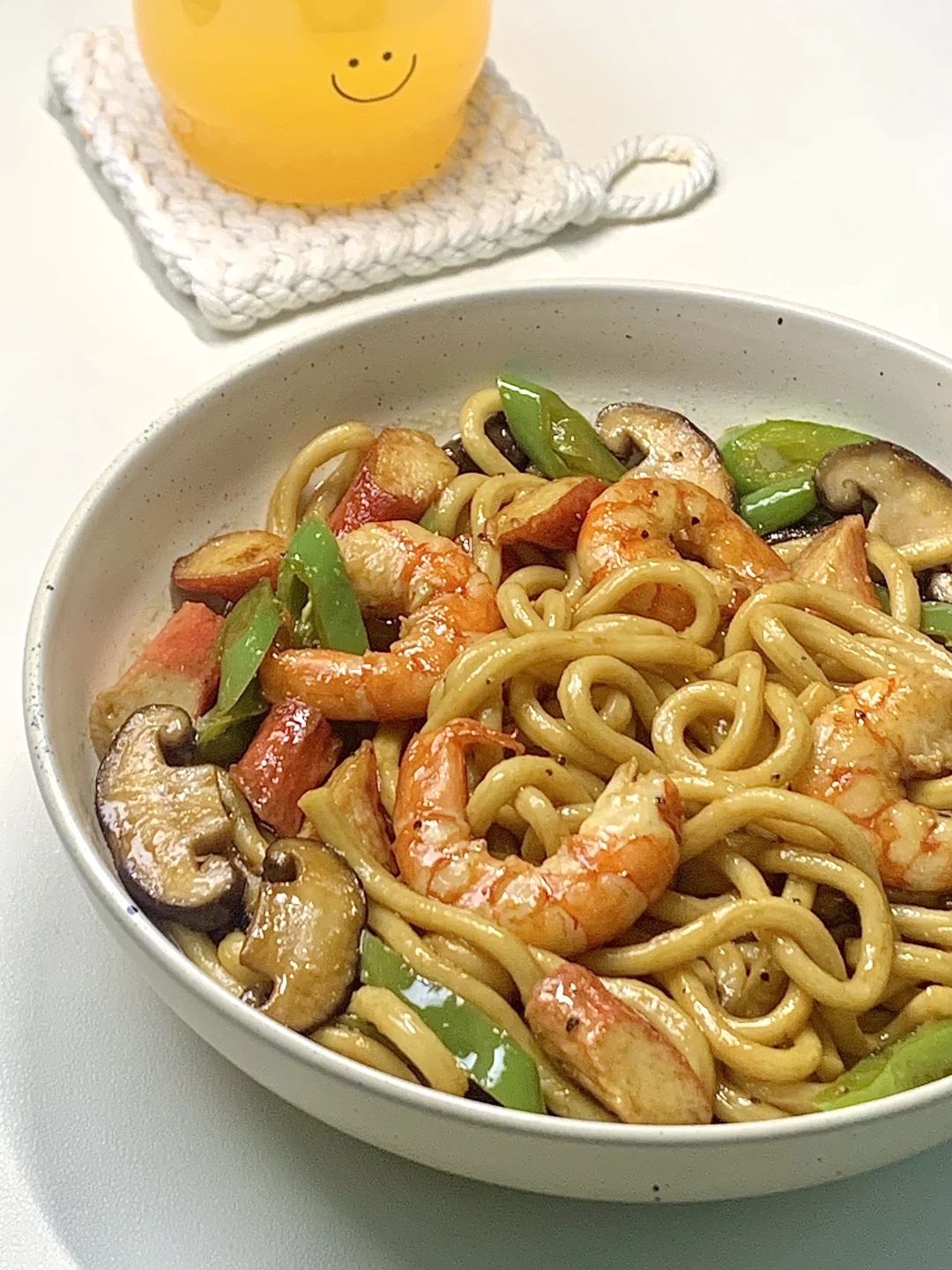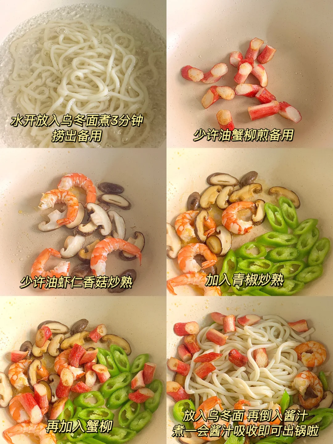 今天的晚餐是一个人的健康餐 我称之为杂蔬虾仁乌冬面🍜 低脂~~且都是我爱的食材!! 干净的饭饭,很好次~ 做起来也简单 🍀食材:乌冬面、虾仁、青椒、香菇、蟹柳 🍃做法:步骤如图上⬆️ [飞吻R]酱汁:2勺生抽+少许老抽+半勺蚝油+适量黑胡椒+半勺淀粉小半碗清水拌匀✅