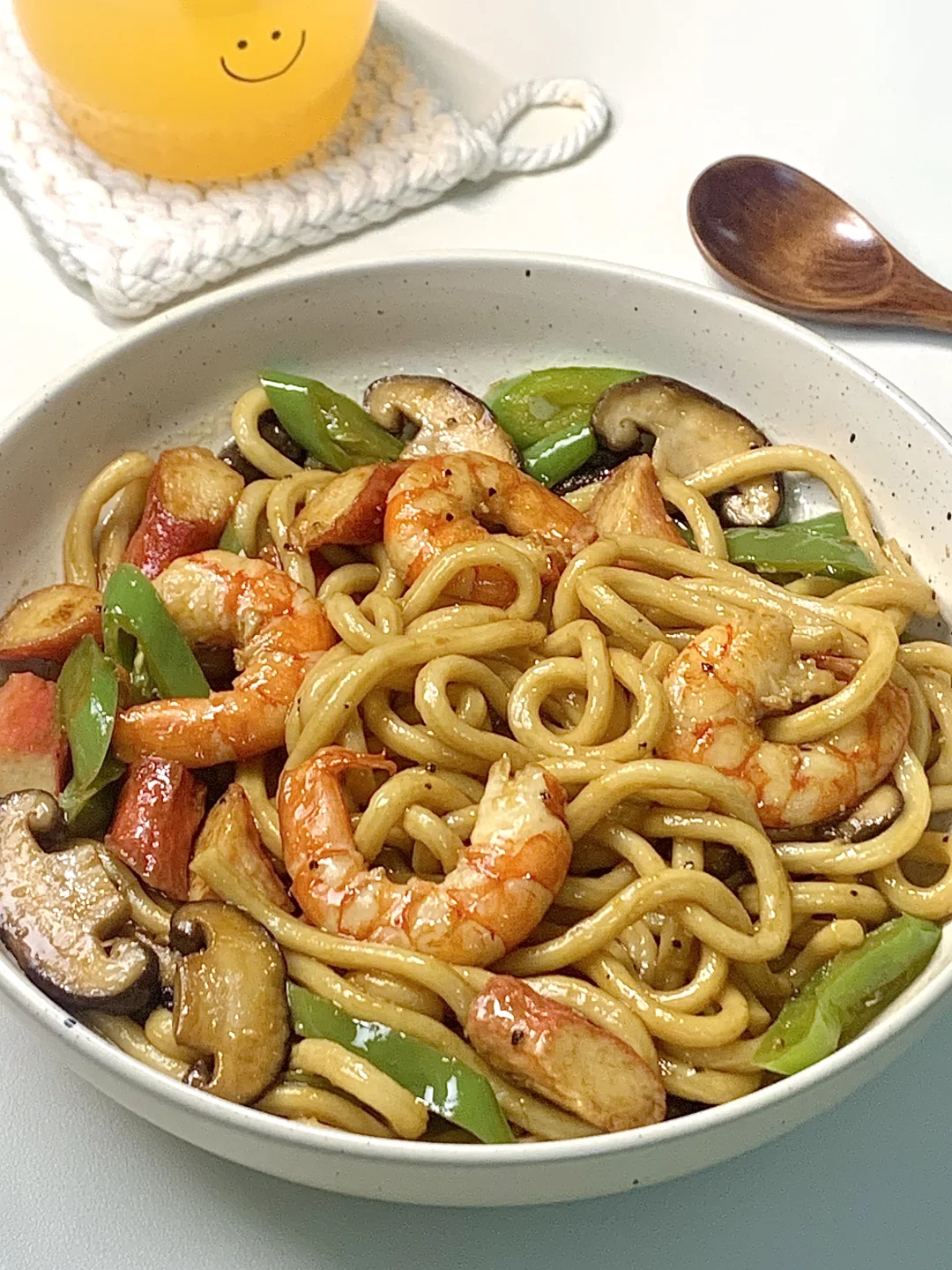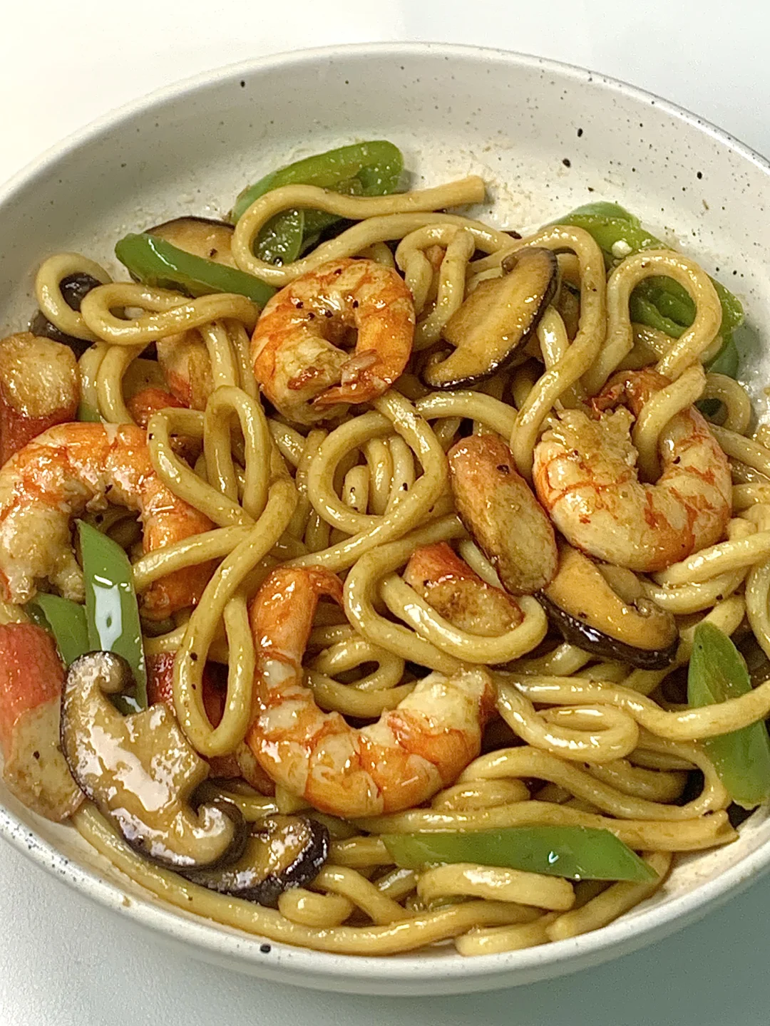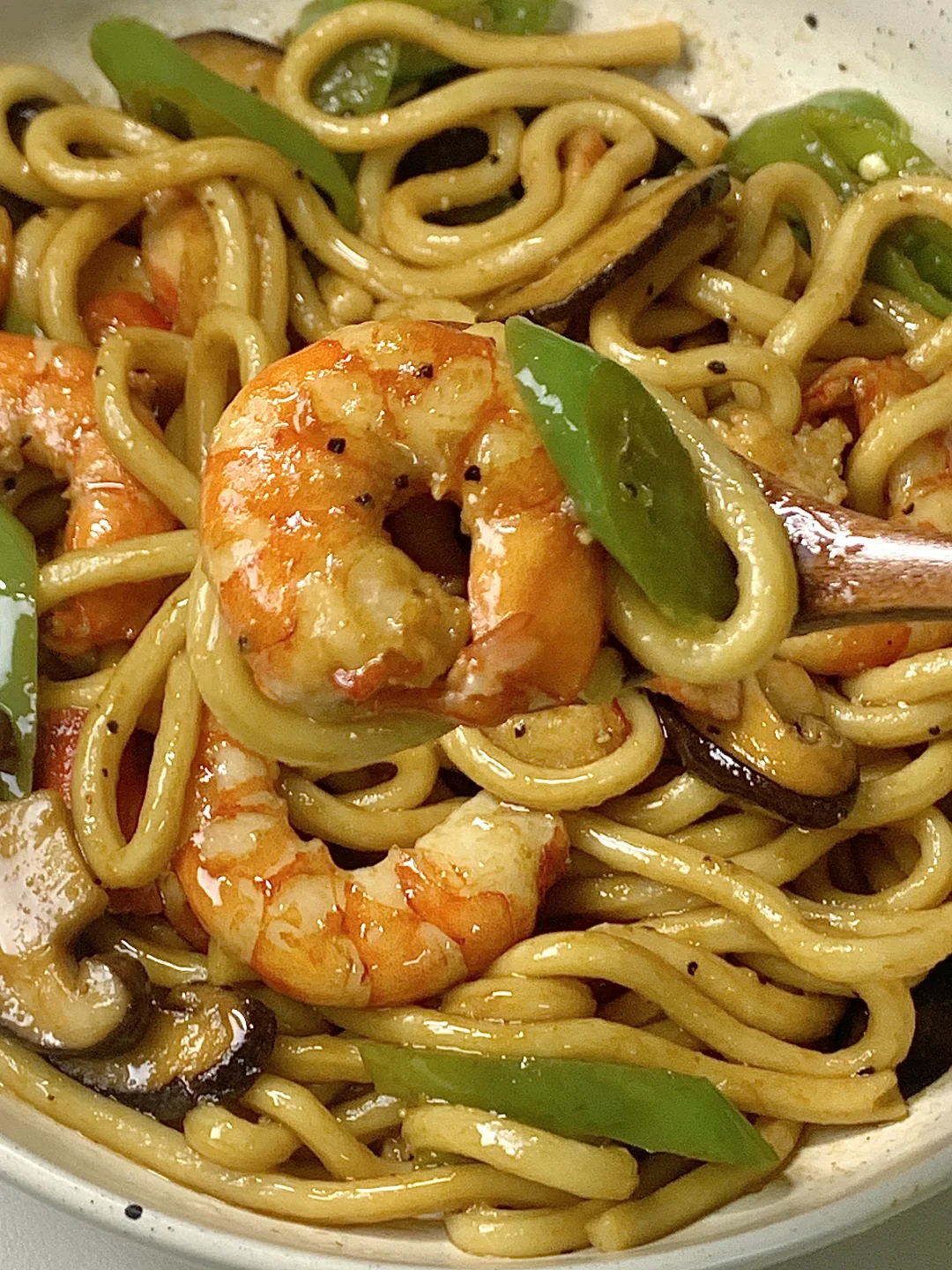 今天的晚餐是一个人的健康餐 我称之为杂蔬虾仁乌冬面🍜 低脂~~且都是我爱的食材!! 干净的饭饭,很好次~ 做起来也简单 🍀食材:乌冬面、虾仁、青椒、香菇、蟹柳 🍃做法:步骤如图上⬆️ [飞吻R]酱汁:2勺生抽+少许老抽+半勺蚝油+适量黑胡椒+半勺淀粉小半碗清水拌匀✅