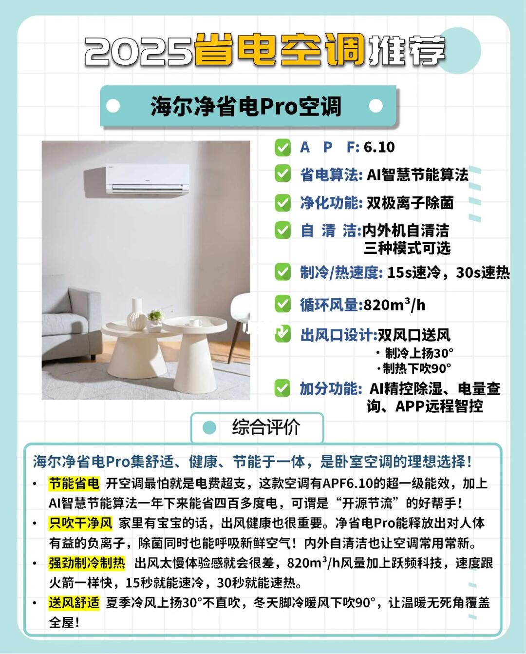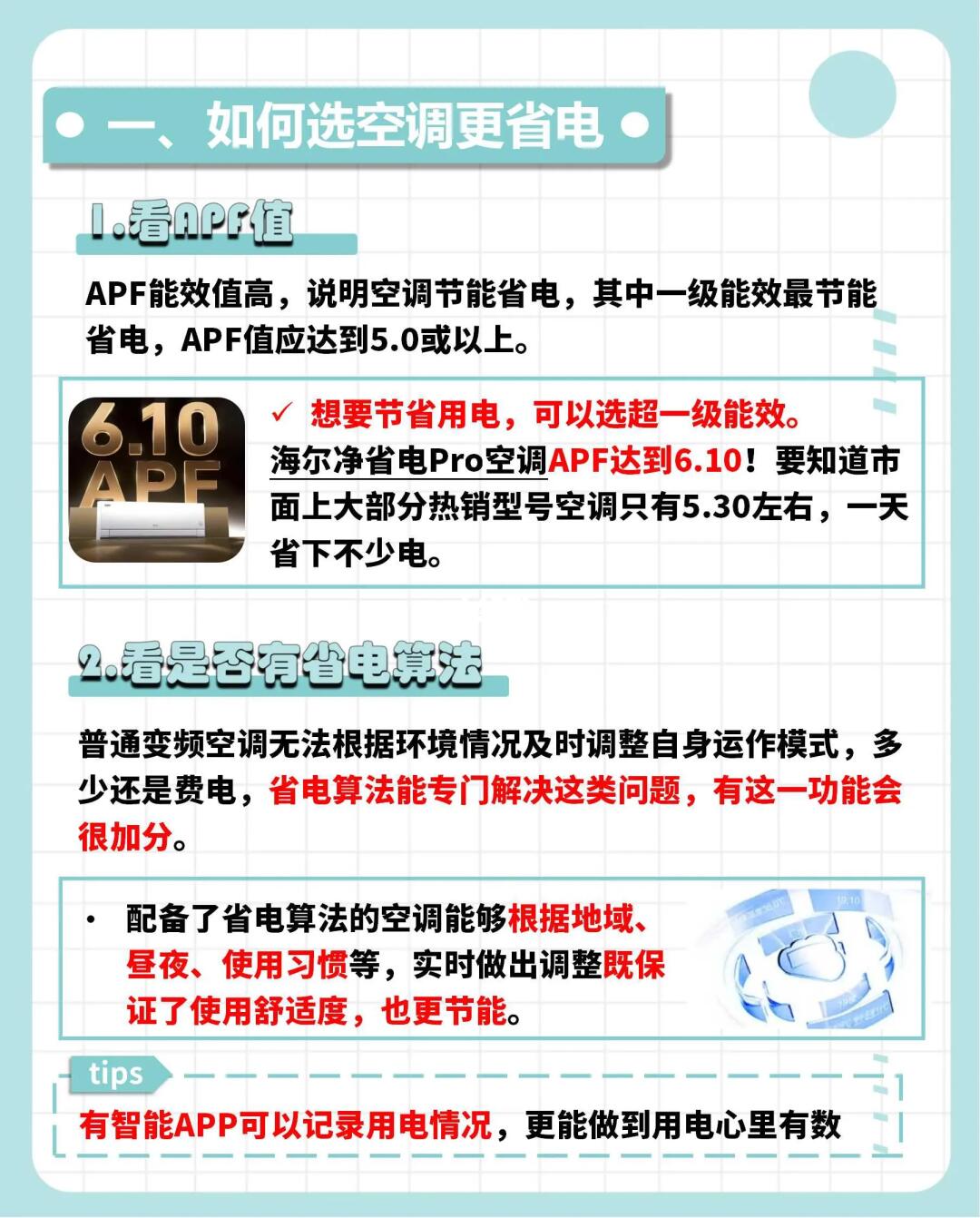 🔺想要节省用电,选超一级能效,海尔净省电Pro空调APF达到6.10,要知道市面上大部分热销型号空调只有5.30左右,一天省下不少电费!
