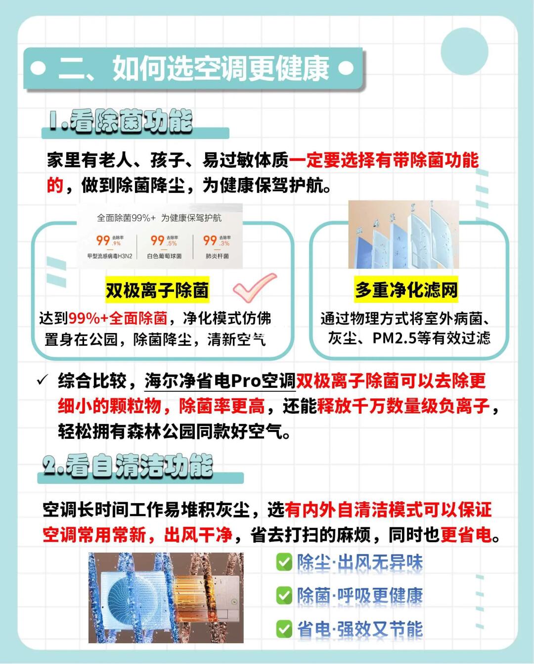 🔺家里有老人、孩子、易过敏体质一定要选择有带除菌功能的,海尔净省电Pro双极离子除菌能去除更细小的颗粒物,除菌率更高,还能释放千万数量级负离子,轻松拥有森林公园同款好空气。