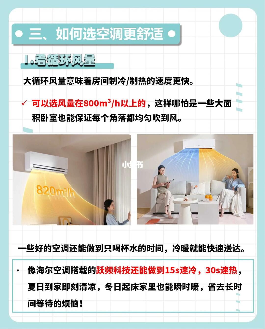 🔺选800m³/h以上的,哪怕是一些大卧室也能保证每个角落都均匀吹到风,好的空调还能做到15s速冷,30s速热,喝杯水的时间冷暖就能快速送达!