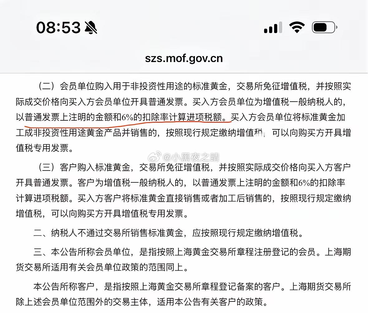 卖金条的天塌了?等下慢慢研究,不能抵扣的话,那6%真不少,和日本同步了?