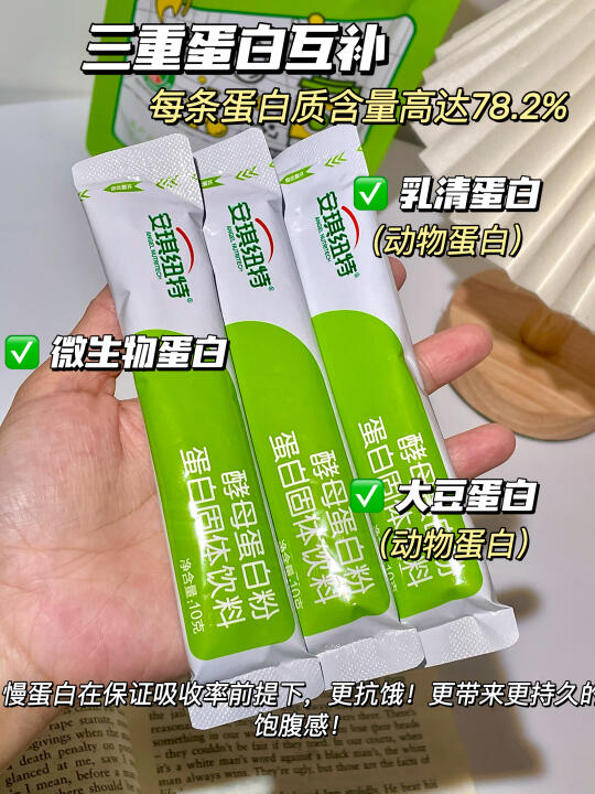 它是乳清蛋白+大豆蛋白+微生物蛋白 三重蛋白矩阵,食用酵母粉是慢蛋白,更能够延长饱腹感!!