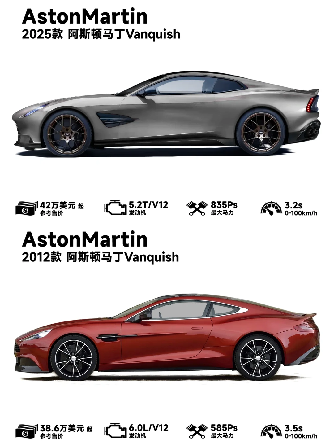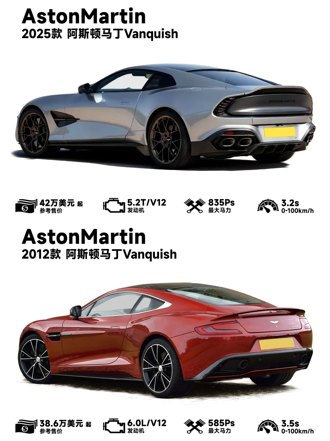 2012年,Vanquish取代DBS并换装了6.0LV12发动机, 被誉为史上最美GT跑车!时隔12年后,全新Vanquish搭载5.2T双涡轮增压V12发动机再度回归!最大马力 835匹, 最大扭矩1000牛米,零百加速3.2秒! 目前Vanquish海外售价为42万美元 ,将于2024年四季度交付,每年限产1000台! 新旧Vanquish,你更喜欢谁? [PK]