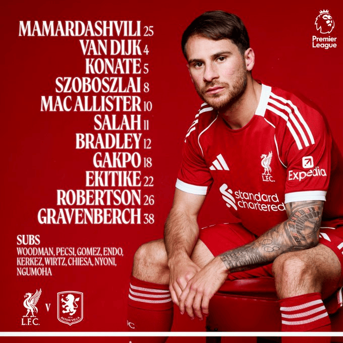 利物浦首发:25-马马达什维利、12-布拉德利、4-范戴克、5-科纳特、26-罗伯逊、10-麦卡利斯特、38-赫拉芬贝赫、8-索博斯洛伊、11-萨拉赫、22-埃基蒂克、11-萨拉赫