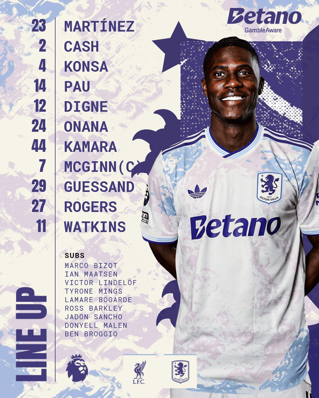 阿斯顿维拉首发:23-达米安-马丁内斯、2-卡什、4-孔萨、14-保-托雷斯、12-迪涅、24-奥纳纳、44-卡马拉、7-麦金、29-盖桑、27-摩根-罗杰斯、11-沃特金斯