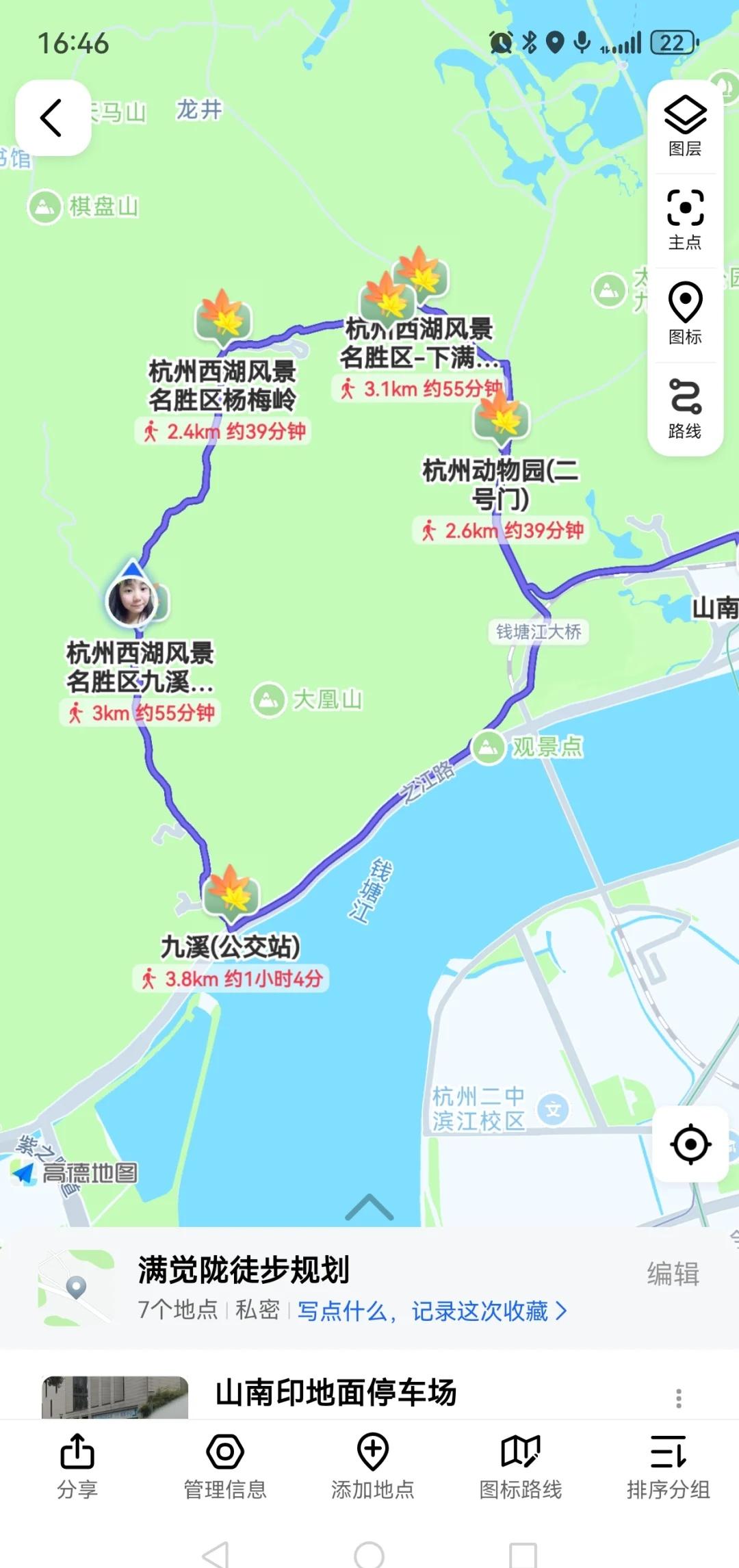 满觉陇🚗徒步路线推荐 今天去了满觉陇徒步,路上的桂花都开了,超级香,一路走到九溪,路上风景很好,很适合徒步。走下来一圈,感觉路线还不错,开车过去停车也还挺方便的,给大家推荐一下 停车到山南印停车场(6元一小时)→公交车到石屋洞→下满觉陇→汤屋→上满觉陇→杨梅岭→理安寺→九溪烟树→ 九溪公交站→ 公交车再回到山南印停车场 整体走下来花了三个多小时,其中石屋洞的桂花开的最好最香,桂花树也是最高的。 杨梅岭到九溪烟树的路很清幽,树长的又高又直,空气也很清新,沿途有很多茶馆和咖啡馆,不用担心路上太累没有休息的地方。西湖 桂花 满觉陇