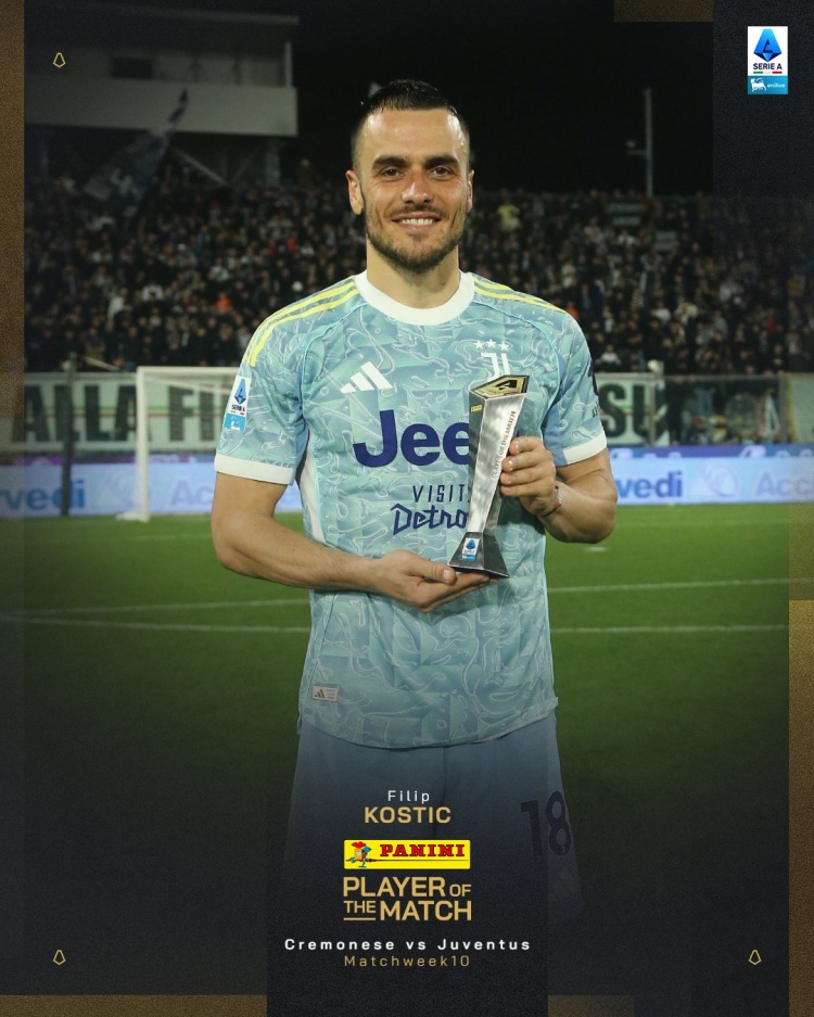开场闪电破门!科斯蒂奇当选尤文vs克雷莫内塞全场最佳球员