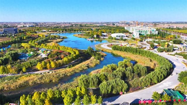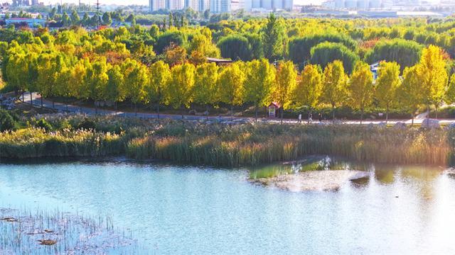 11月1日,无人机拍摄的宁晋县凤鸣湖公园及周边景观。