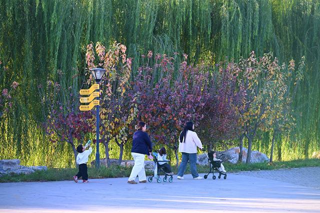 11月1日,居民在宁晋县凤鸣湖公园赏景游玩。