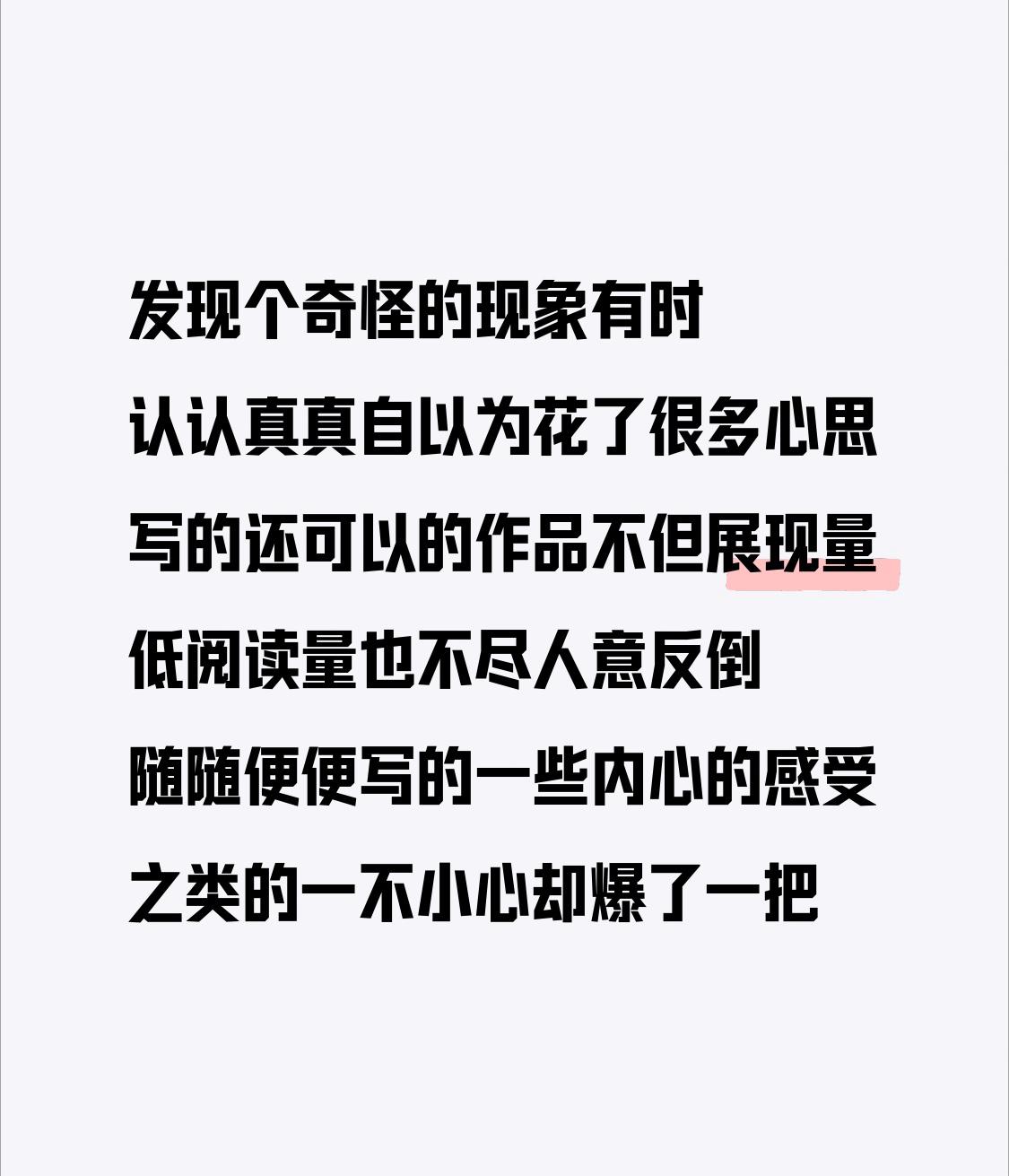 我发觉了一个相当奇特的现象。 有时候,我全情投入创作,自认为付出诸多心血,写出了还算不错的作品。 但这些作品不仅展现量少得可怜,阅读量也差强人意。 反倒是那些随意写下的内心感悟,不经意间就成了爆款。 作品的点赞量 个人创作感想 写作冲动 普通人创作灵感 原来创作很简单 鉴赏散文的能力 优秀作品创作