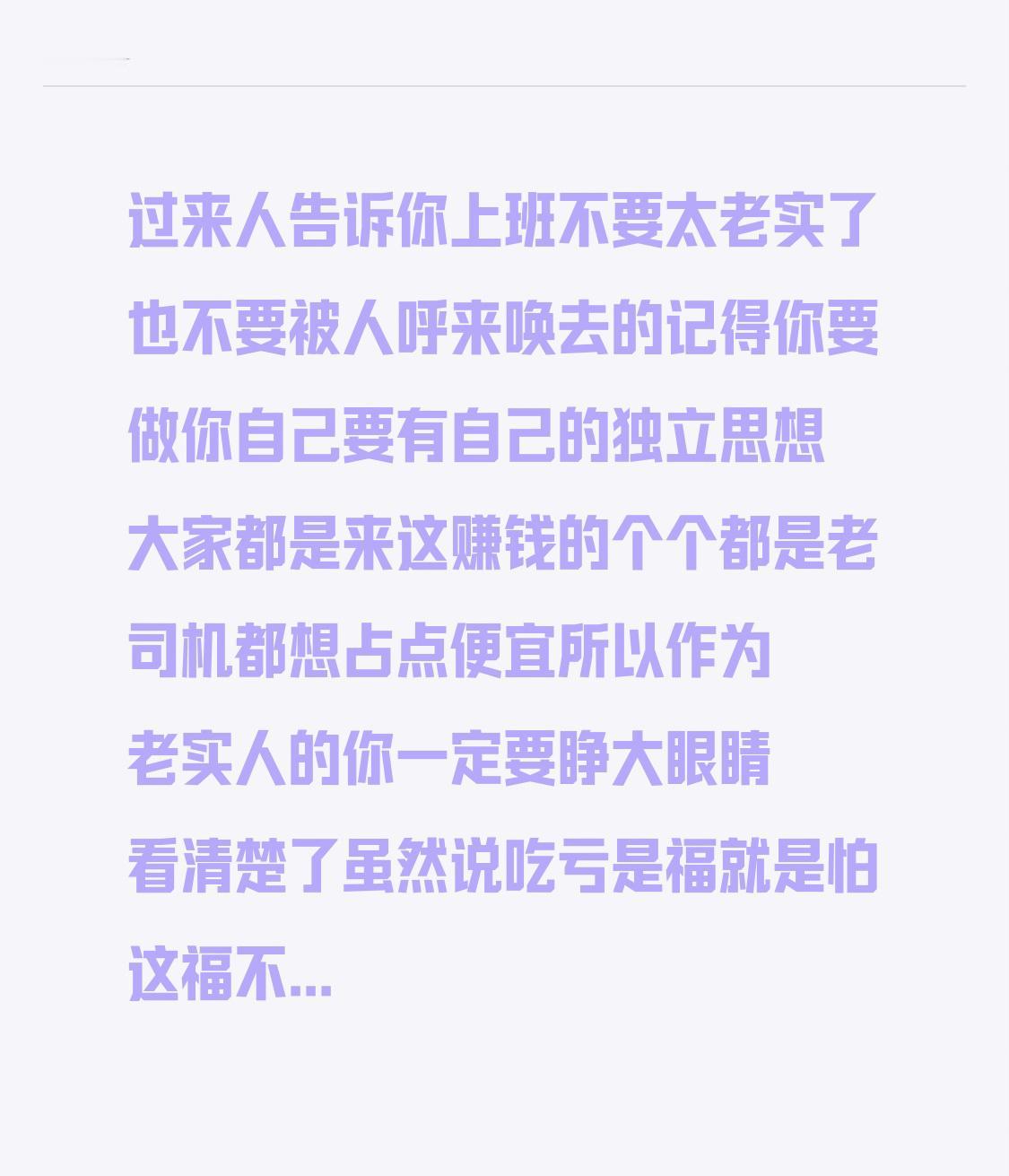 过来人跟你说 上班别太老实 也别让人随意使唤 记住,要做自己 得有独立思想 大家来这儿都是为了赚钱 个个都是老手 都想着占点便宜 所以,老实的你 一定要擦亮眼睛看仔细 虽说吃亏是福 就怕这福到不了你头上 对上班的态度 上班人的心声 社会老实人 老实人生存法则 上班打工人 上班工作意义 对上班的态度 老实人 职场真实感受 上班人的心声 职场人生存现状 社会老实人对上班的态度