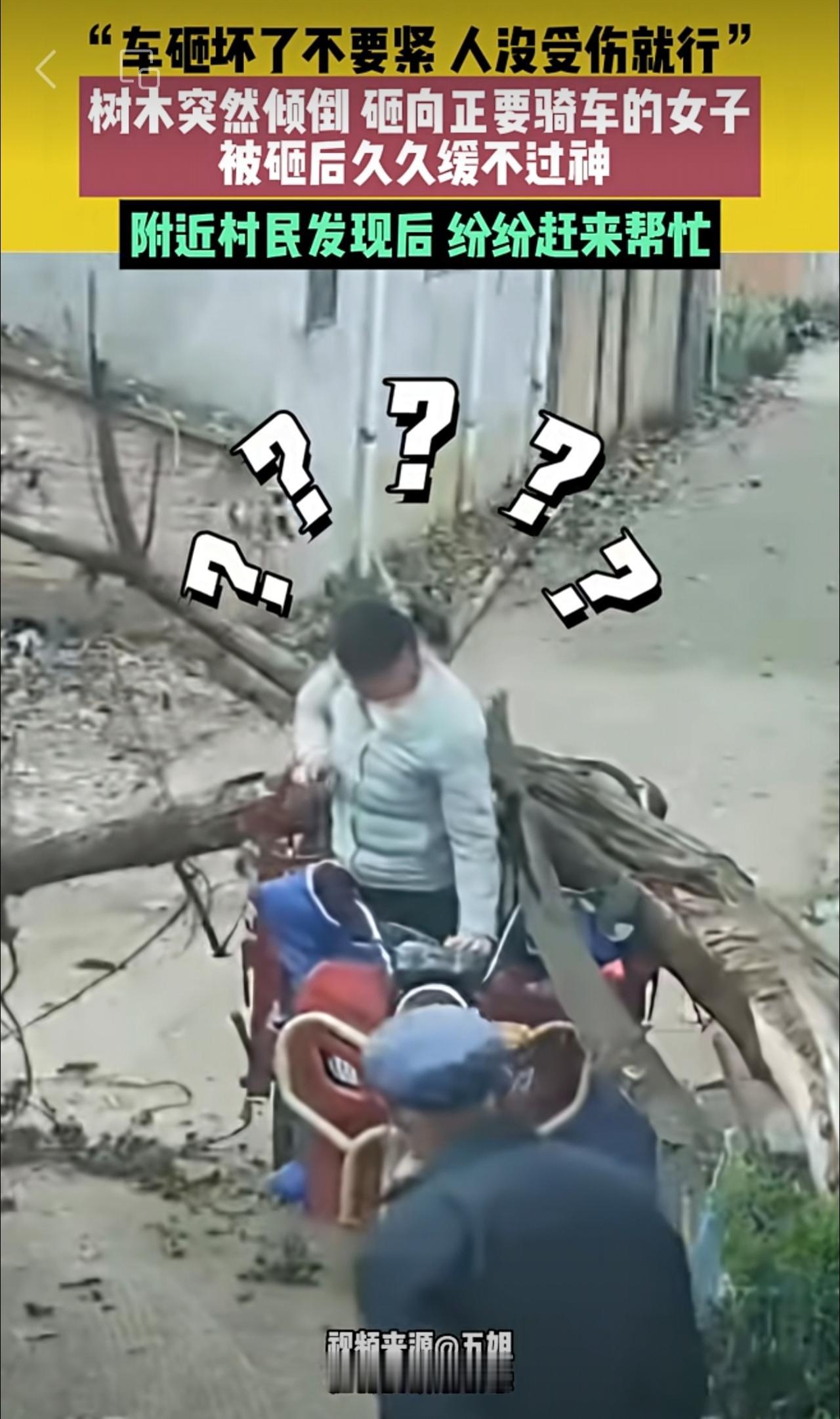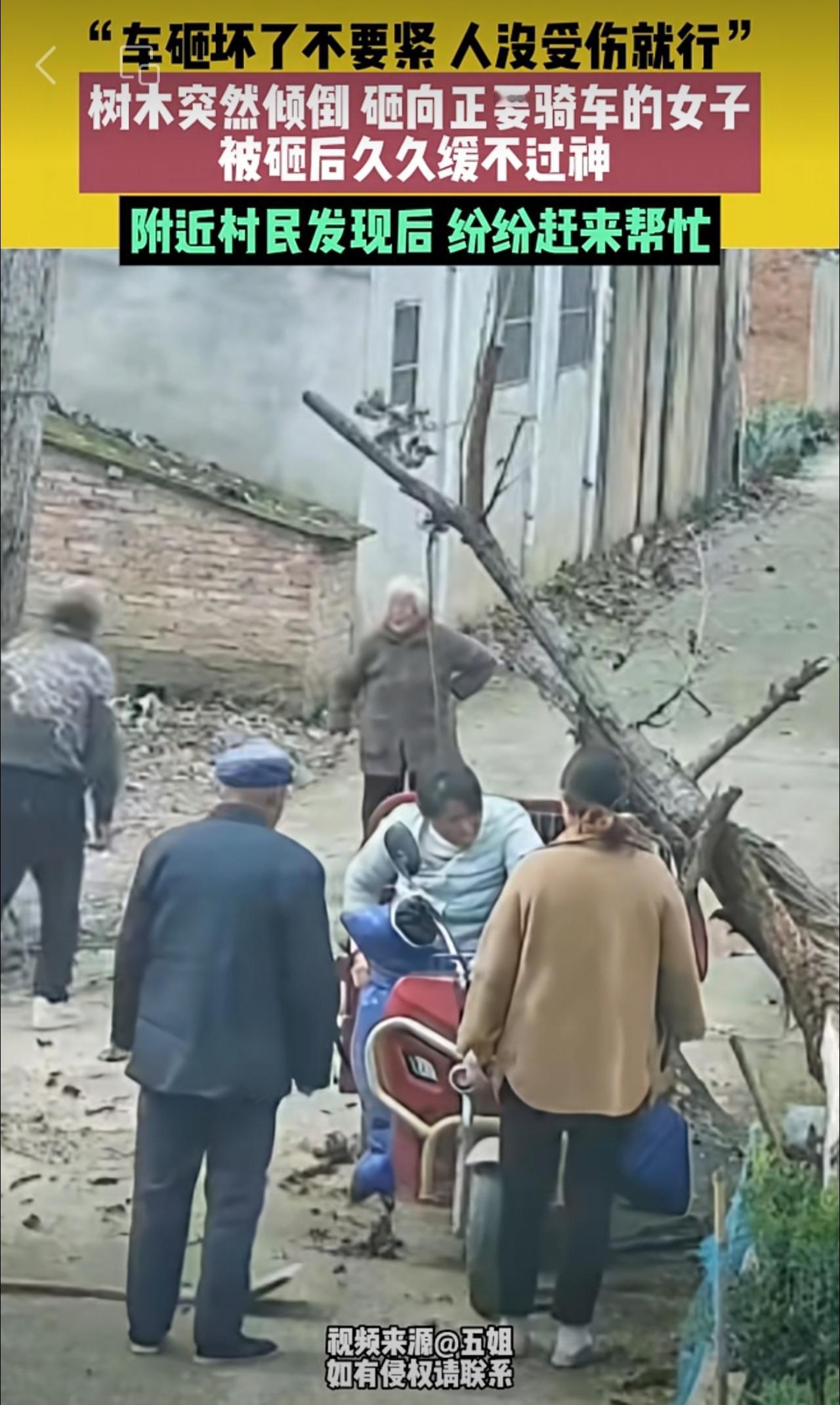 11月1日安徽阜阳,“车砸坏了不要紧,人没受伤就行”,树木突然倾倒,砸向正要骑车的女子,被砸后久久缓不过神 ,附近村民发现后,纷纷赶来帮忙