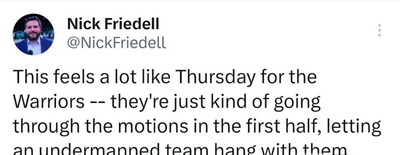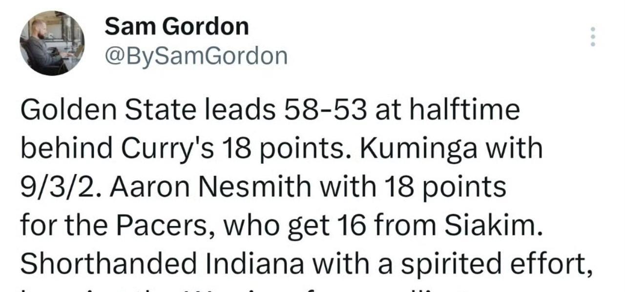 勇记们纷纷吐槽勇士本场表现: “勇士上半场跟一只伤兵满营,未尝胜绩的球队打得有来有回。西亚卡姆火力全开,击溃了勇士的区域联防。内史密斯手感火热,步行者可是背靠背,但在控球速度上,他们似乎更快。” “人手短缺的步行者顽强拼搏,勇士居然没有拉开比分。” “这场很像上一场打雄鹿,感觉勇士上半场只是例行公事,让一只人手不足的球队跟上了节奏。”