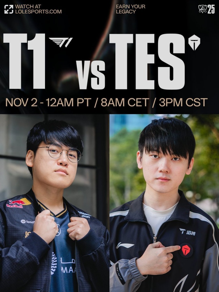 直播吧11月02日讯2025全球总决赛淘汰赛Day6,今天将迎来四强半决赛的最后一场,TES(LPL三号种子)vsT1(LCK四号种子)。
