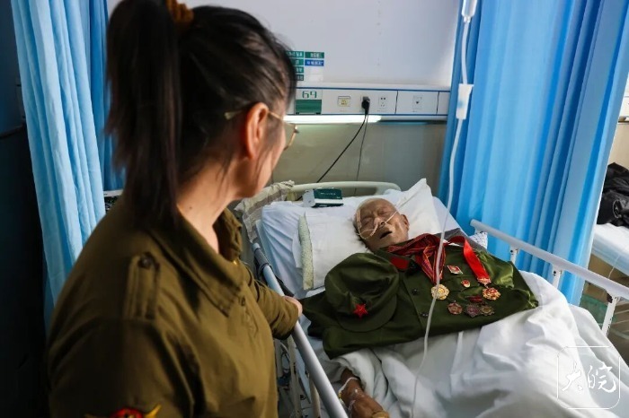 11月1日,阜阳在市人民医院南区的病房里,记者见到了躺在病床上的宫春贤。宫秀丽小心翼翼地向记者展开父亲最爱穿的老军装,旁边整齐摆放着数枚锃亮的抗美援朝荣誉纪念章。