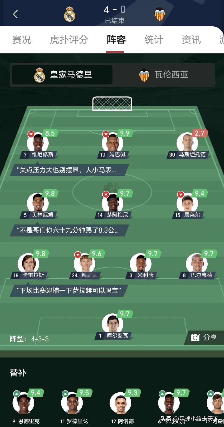 好久没看过皇马大胜并且零封对手了,看来今年西甲冠军应该没悬念了! 今天这场应该是本赛季目前为止看得最舒服的一场比赛,居勒尔,贝林,维尼,姆巴佩之间的化学反应开始显现,球队氛围也很好,只是小马哥还没融进来,留给他的时间不多了,这个位置可不是只有他一个人选。 今天的全场最佳应该给a费,多少干净的抢断,不停的前插,三四个脏球的处理,造一个点,一个进球,太好了。另外就说一个场面,比赛快结束时候,恩德里克在右路狂奔,两个人没拉住,这几十秒的威胁,大于踢了90分钟的30号,恩德里克值得比30号更多的比赛。