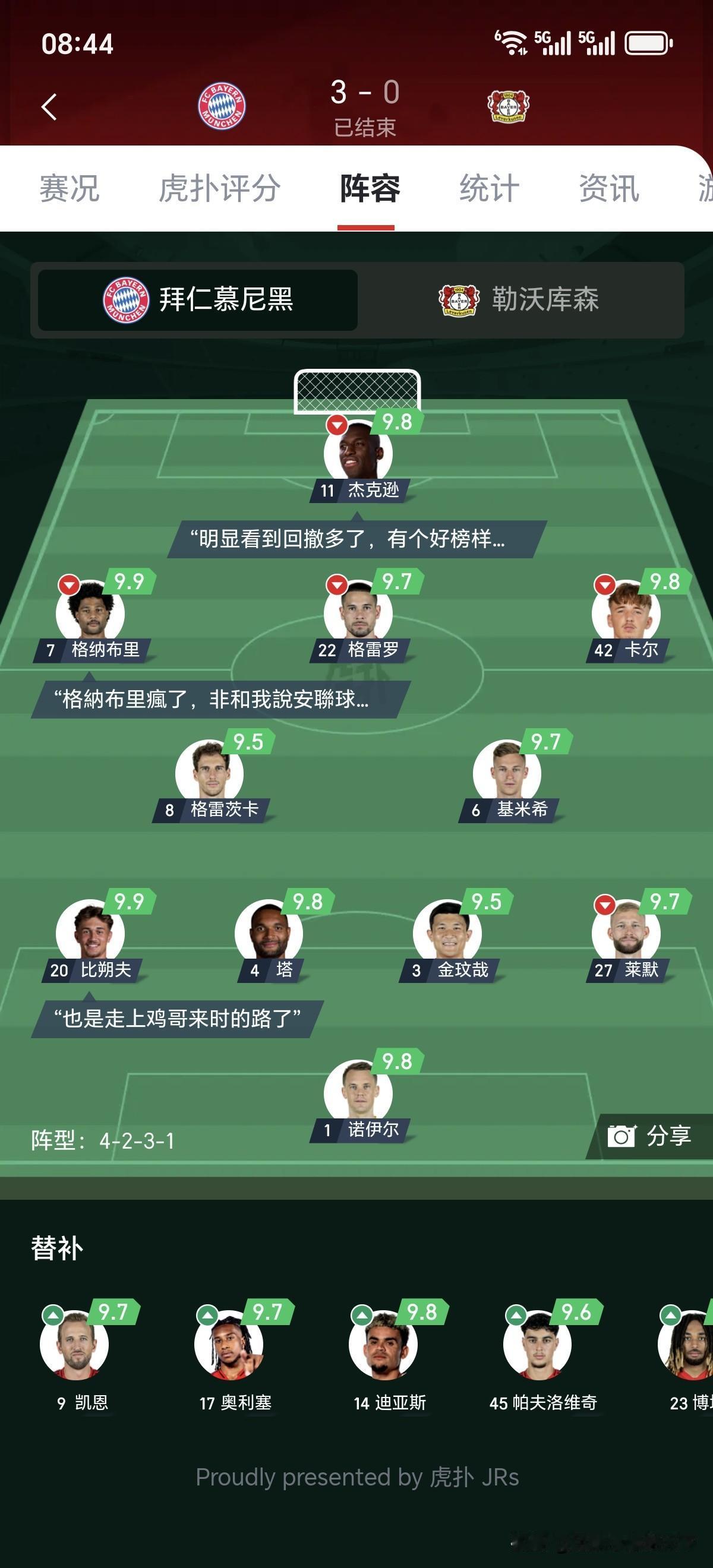 今年德甲已经大结局了,拜仁在德甲踢谁都是踢人机,连替补都全面压制药厂。 目前已经15连胜了,这么下去,搞不好这赛季拜仁会34连胜夺冠! 现在德甲冠军是5大联赛最没悬念的,对手没一个能打的,拜仁每场比赛就像砍瓜切菜一样简单。 我是真没想到,这场拜仁也就基米希、格纳布里、莱默、塔四个主力啊,这都能赢3:0,可见药厂欧冠被虐不是没有道理的。 这赛季拜仁最大的发现就是小将卡尔,这小孩技术比当年克罗斯还要好,而且盘带能力比克罗斯强,才17岁,前途无量啊。