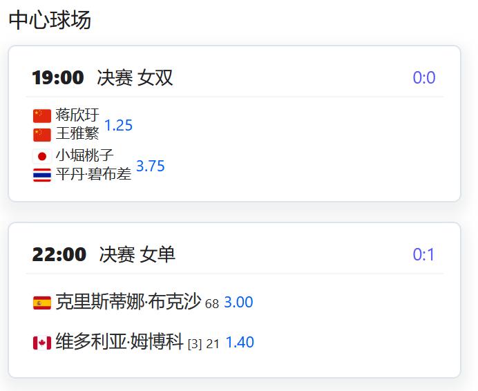 今日赛程: WTA年终总决赛,第二日小组赛: 单打,头号种子萨巴伦卡将对阵8号种子鲍里妮; 3号种子高芙将对阵5号种子佩古拉。 双打,3号种子达布罗斯基/卢特丽芙将对阵5号种子安德烈耶娃/施耐德; 2号种子西尼亚科娃/汤森德将对阵7号种子巴博斯/斯特凡尼。 WTA250赛香港站,女双决赛,蒋欣圩/王雅繁将与小堀桃子/碧布差争夺冠军。