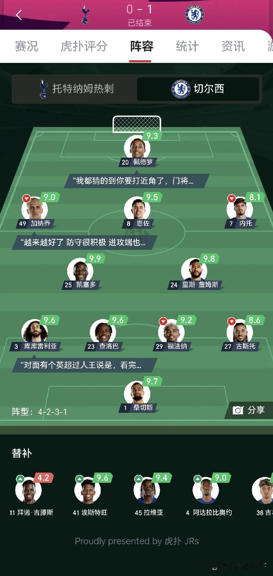 切尔西真是神一场鬼一场啊!上场被桑德兰绝杀,这场又客场拿下了热刺。 车子真是抽象,遇强则强,遇弱则弱,啥时候能稳定啊? 不过车子要是每场都有踢热刺这强度应该能争冠了,目前就是阵容太年轻起伏太大,对于实力不如的对手飘起来,被还手以后又一下懵了手足无措。 今天热刺真的踢得一坨,真不知道前面他们是怎么拿到17分的,全场没有一次有威胁的接近破门的机会。要不是车子浪费机会太多了,早就被打花了。