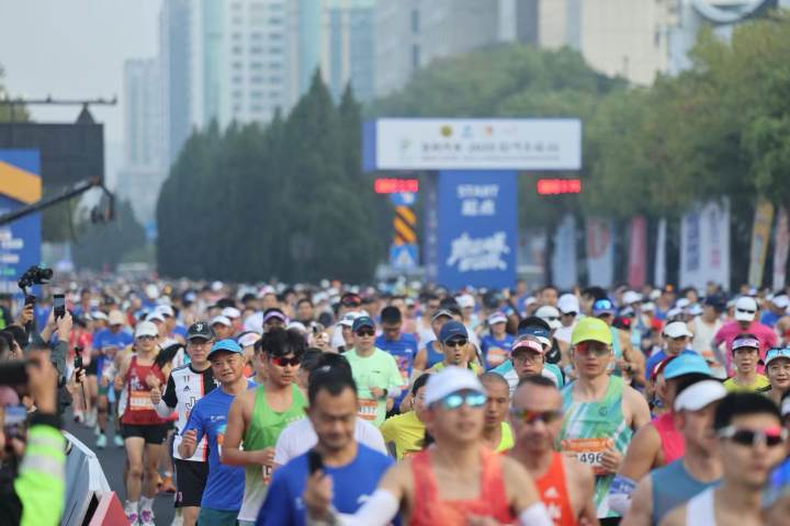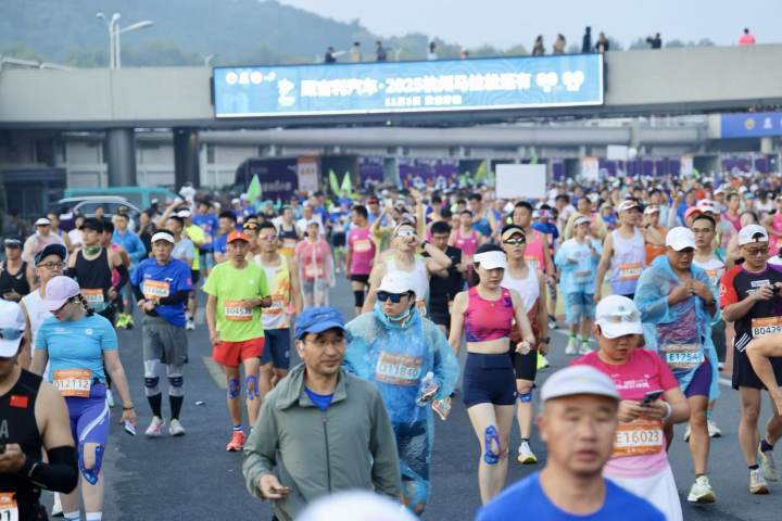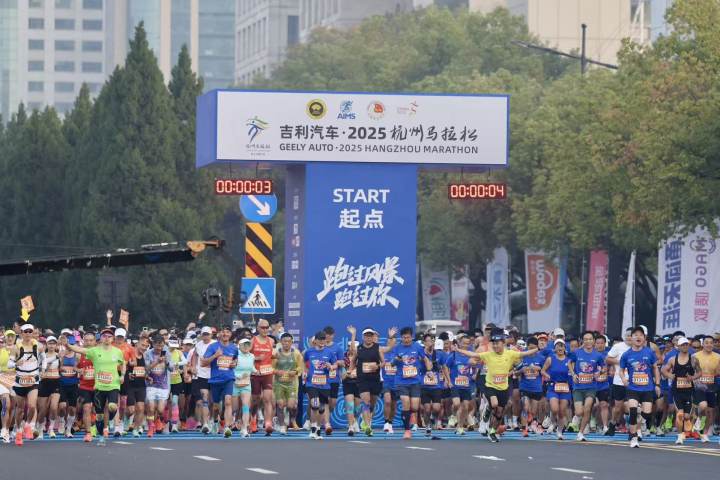 2日上午7点,吉利汽车·2025杭州马拉松在黄龙体育中心鸣枪开跑。