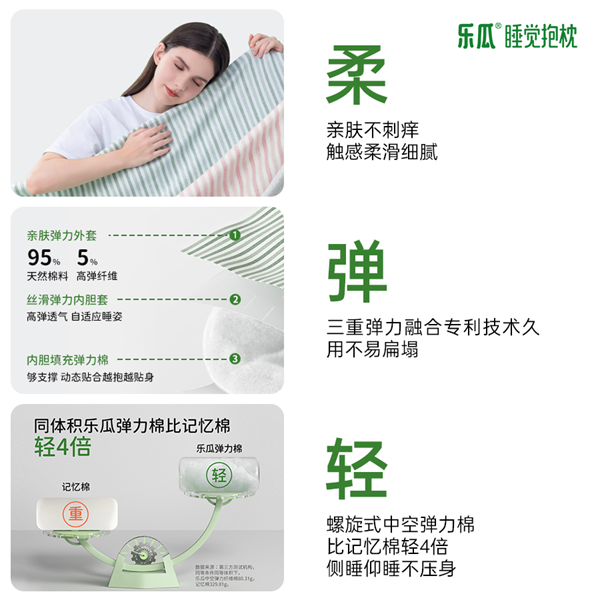 乐瓜睡觉抱枕(SleepingBodyPillow)始终围绕“调、养、护”三大核心理念,针对性改善因错误睡姿引发的腰背酸痛、体态走形等问题,让睡眠成为“修复身体”的过程而非负担。