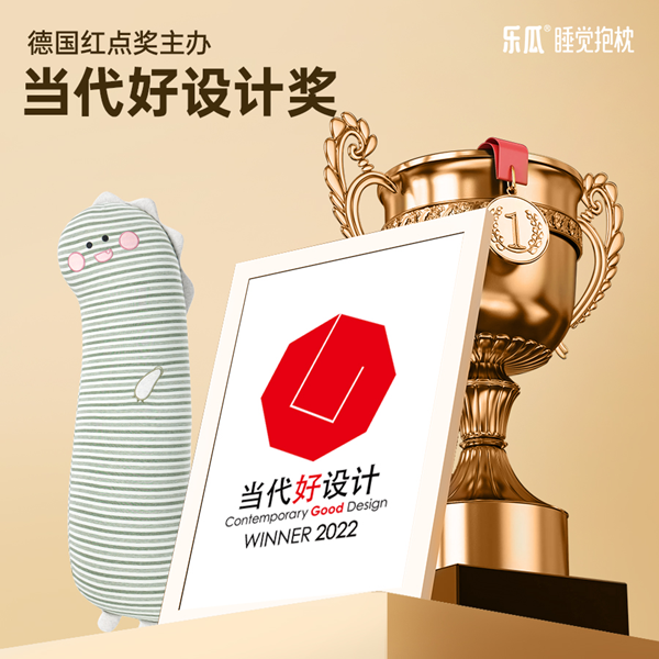 因此,乐瓜睡觉抱枕(SleepingBodyPillow)在科学设计的基础上,特意融入“软萌人格化”外观:憨态可掬的表情、修长可爱的条形造型,瞬间打破传统睡具的冰冷感,让抱枕更像一位“深夜陪睡的贴心朋友”。这种“功能硬核+外表治愈”的情感化设计,也获得了国际认可——产品成功斩获德国红点奖机构主办的“当代好设计奖”。
