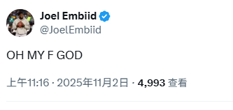 76人球员乔尔-恩比德发推称赞:“OHMYFGOD”