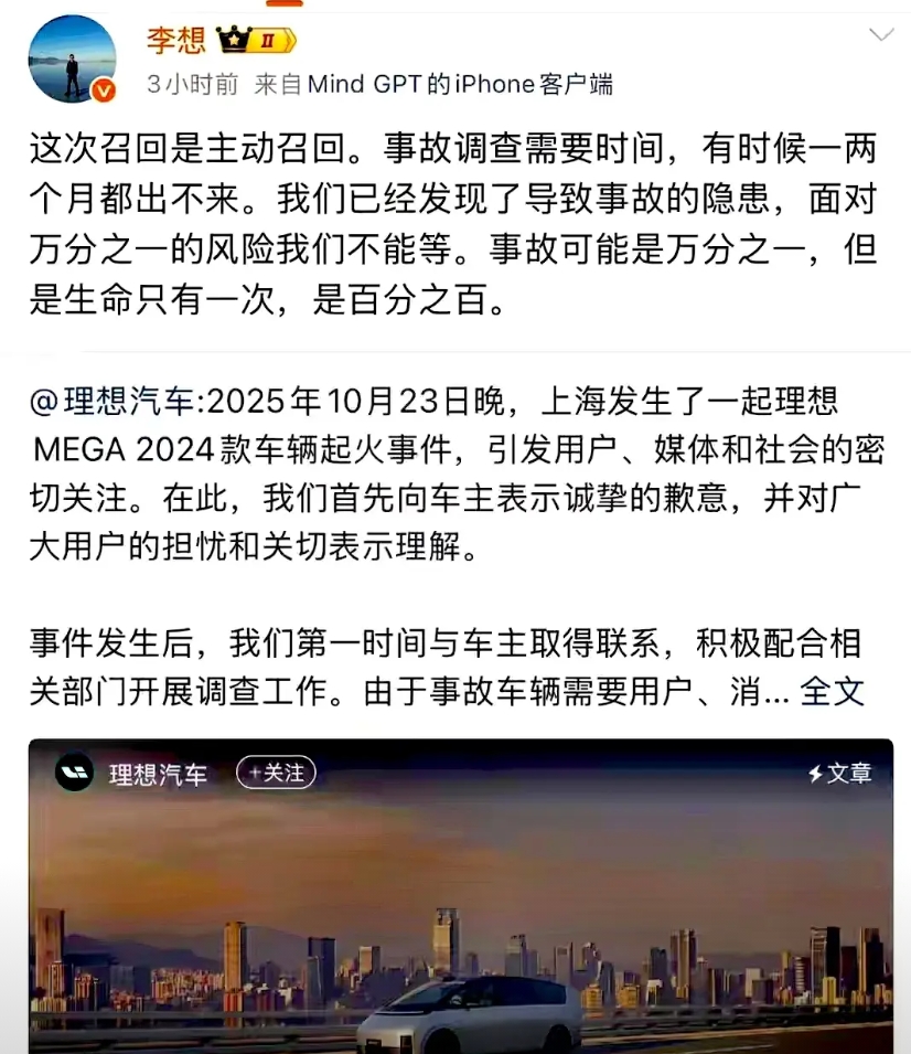 Mega事件迄今为止,还没未彻底调查明白,但理想汽车董事长李想针对Mega事件做