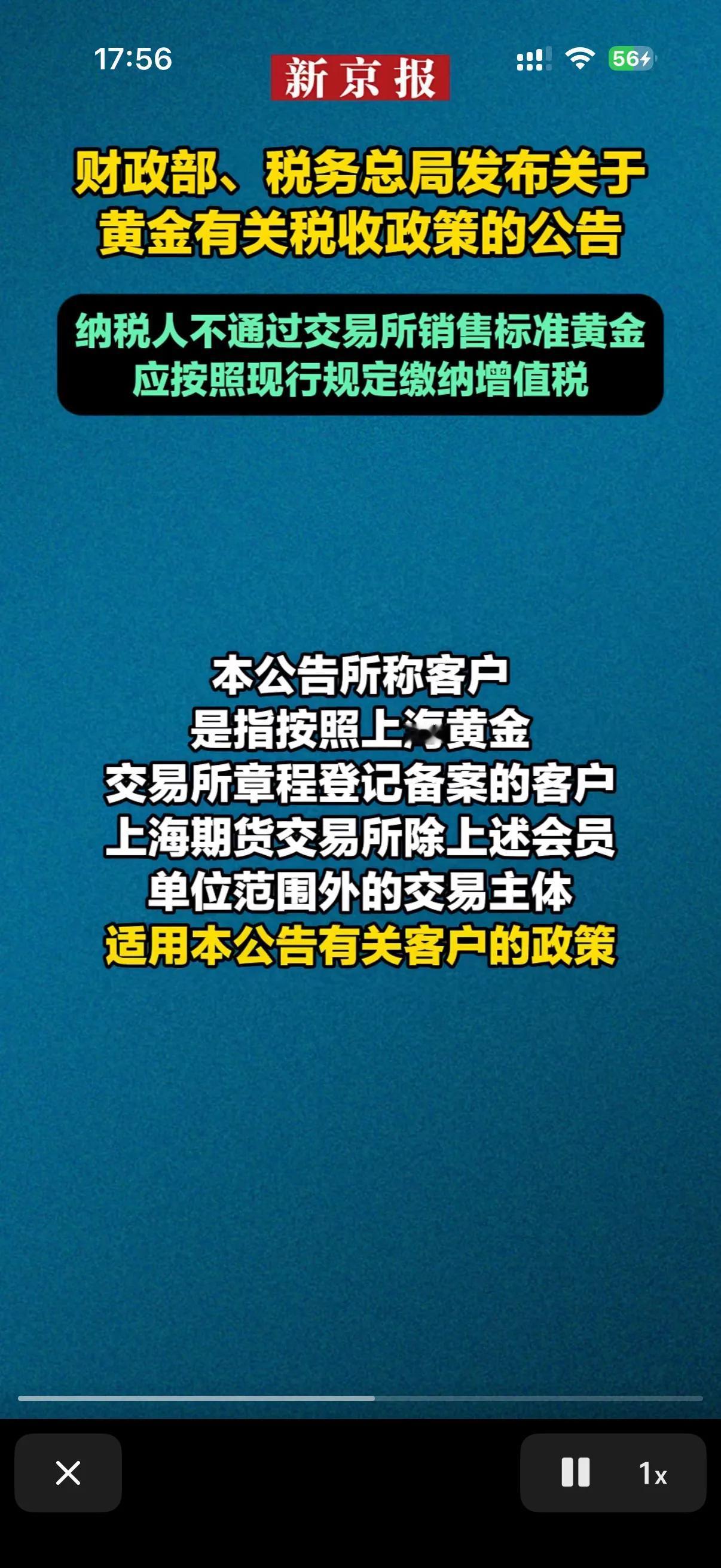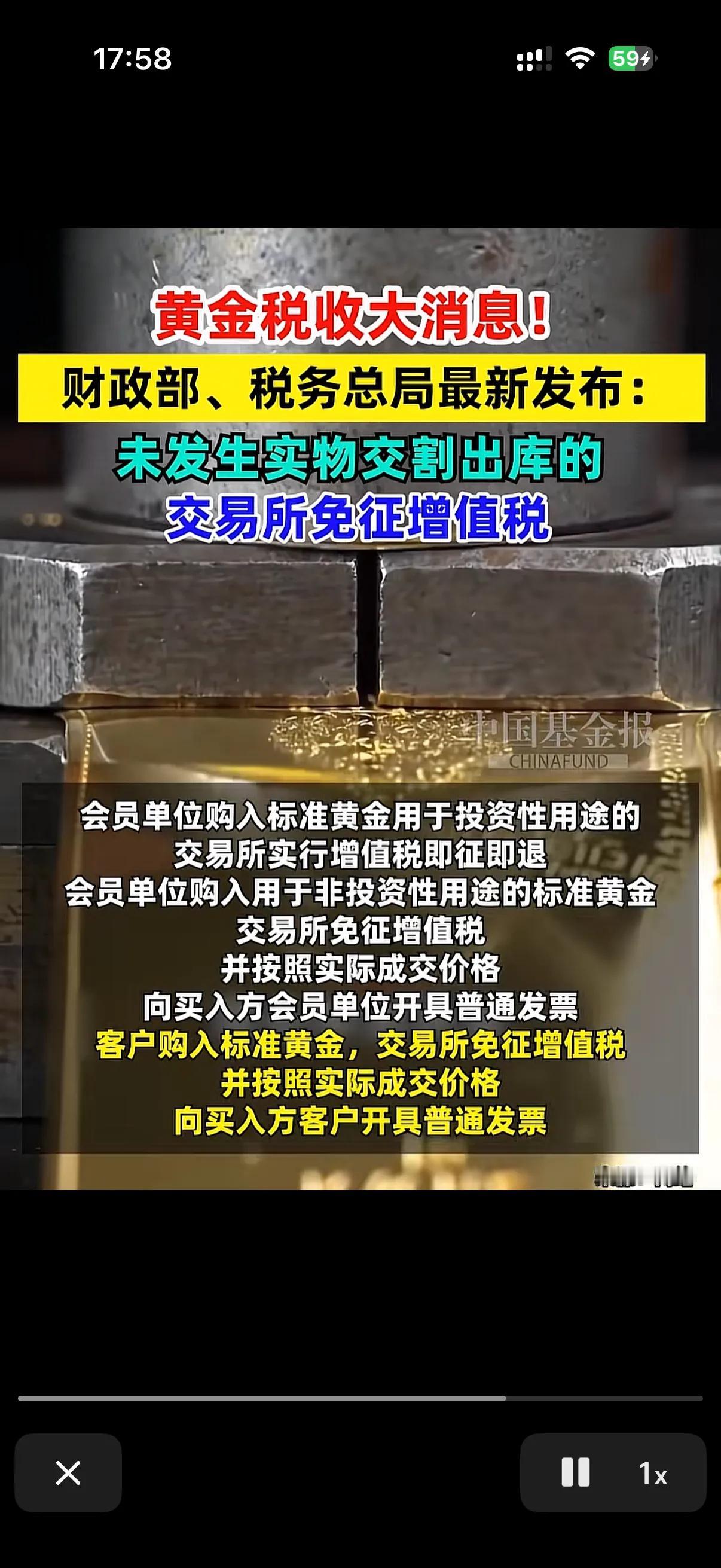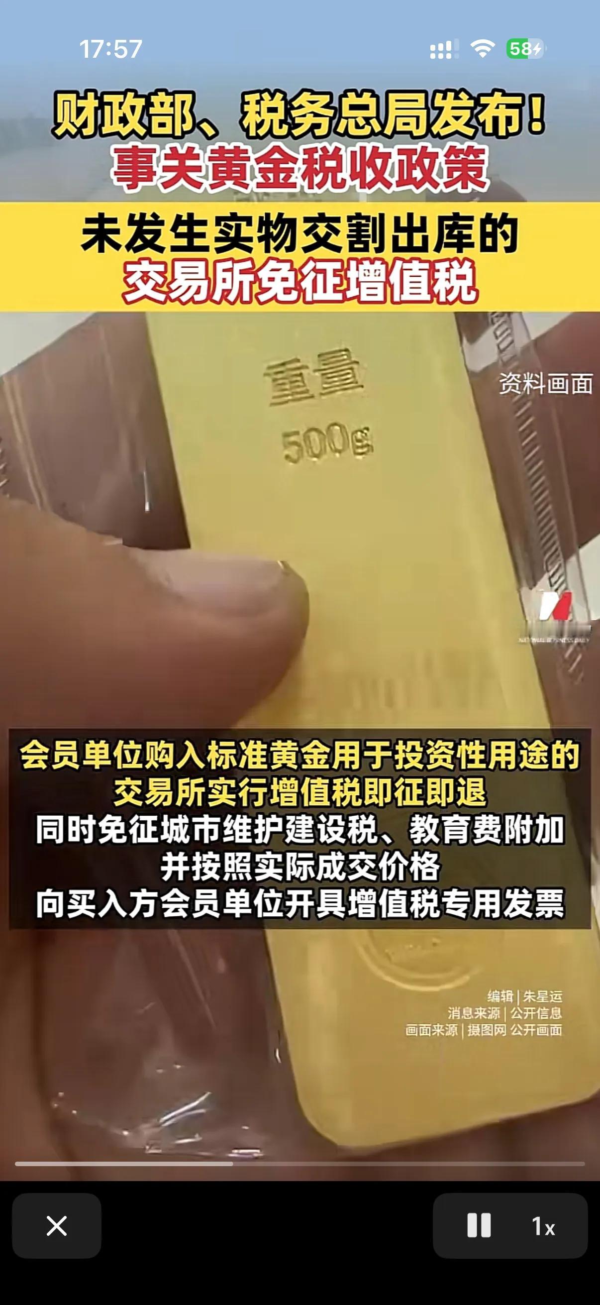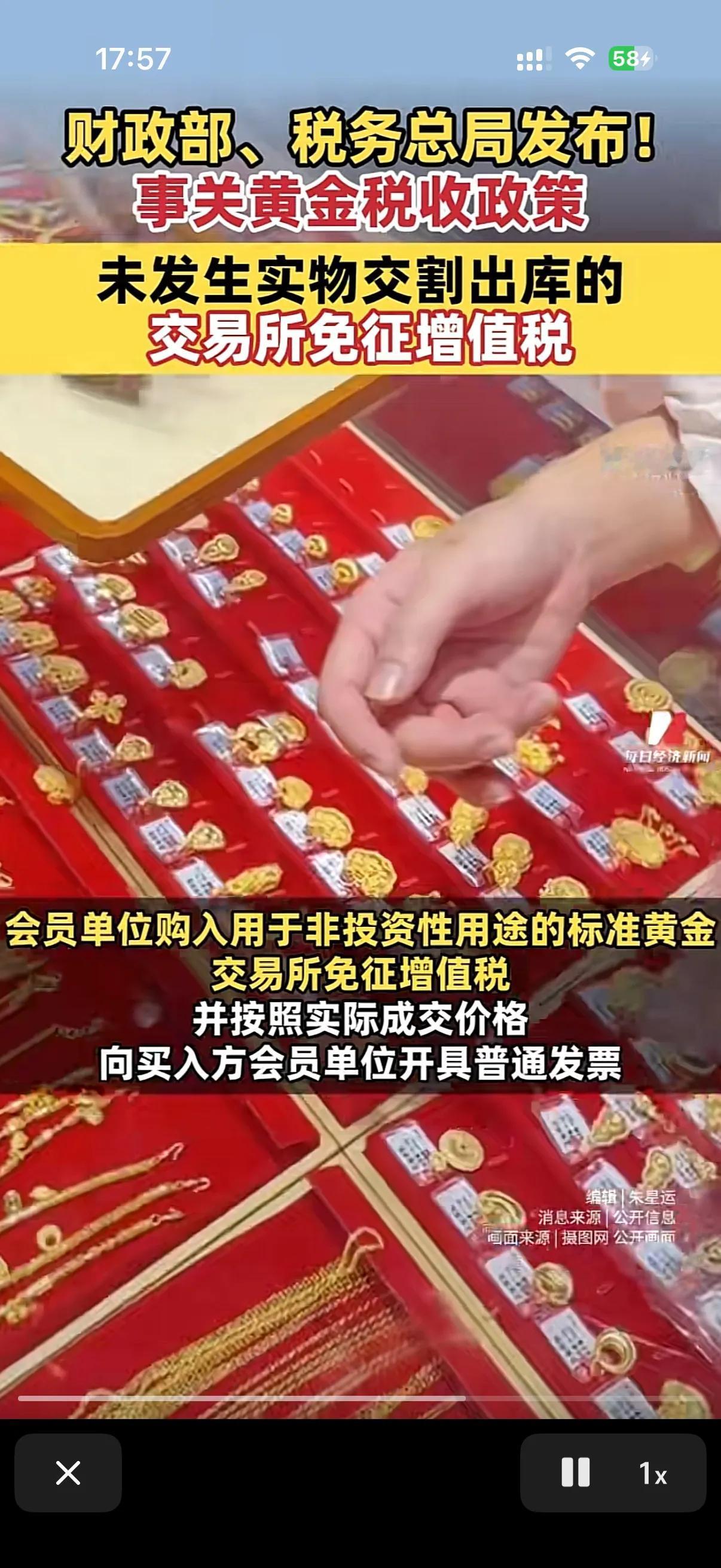 黄金要收税了! 可以说这个周末对于实物黄金的投资者来说绝对算不上一个好的节假日! 因为以后黄金食物交易要收税了,而且还不便宜!百分之13的税! 财政部和税务局发布了最新黄金税收的公告,称以后纳税人不通过交易所销售标准黄金要缴税了! 有些人想我私下里去找二手回收的卖,那就不用缴税了,只能说你们想简单了! 这个规定很多人解读是,当你买黄金首饰和金条这些物品的时候会直接缴纳着百分之十三的税收! 如果是低价位买的黄金饰品或者金条还好,毕竟有机会涨回来这谁受价格,但要是在高位买的那可就惨了! 不过线上黄金交易却不用交税! 一时间不少黄金投资者不知道自己到底该屯实物黄金还是应该继续线上交易了!