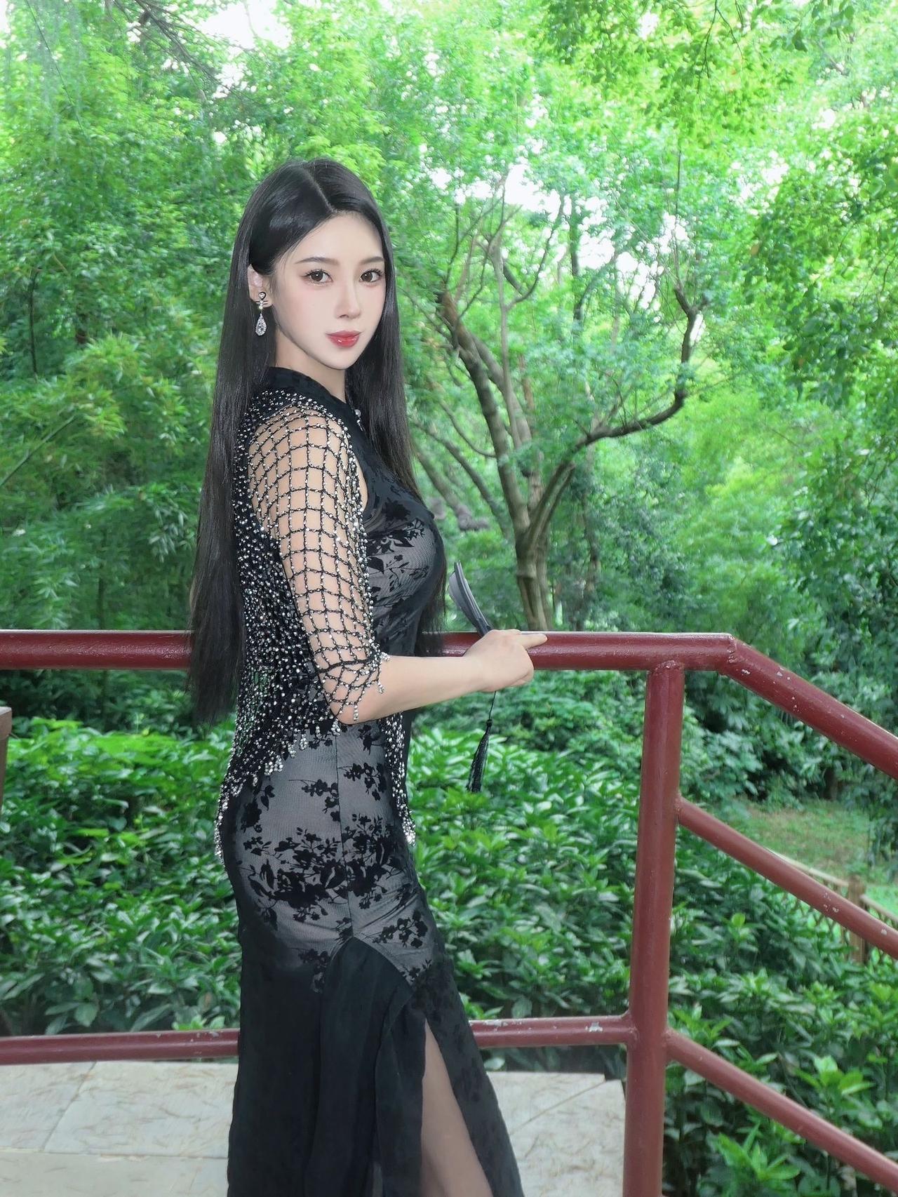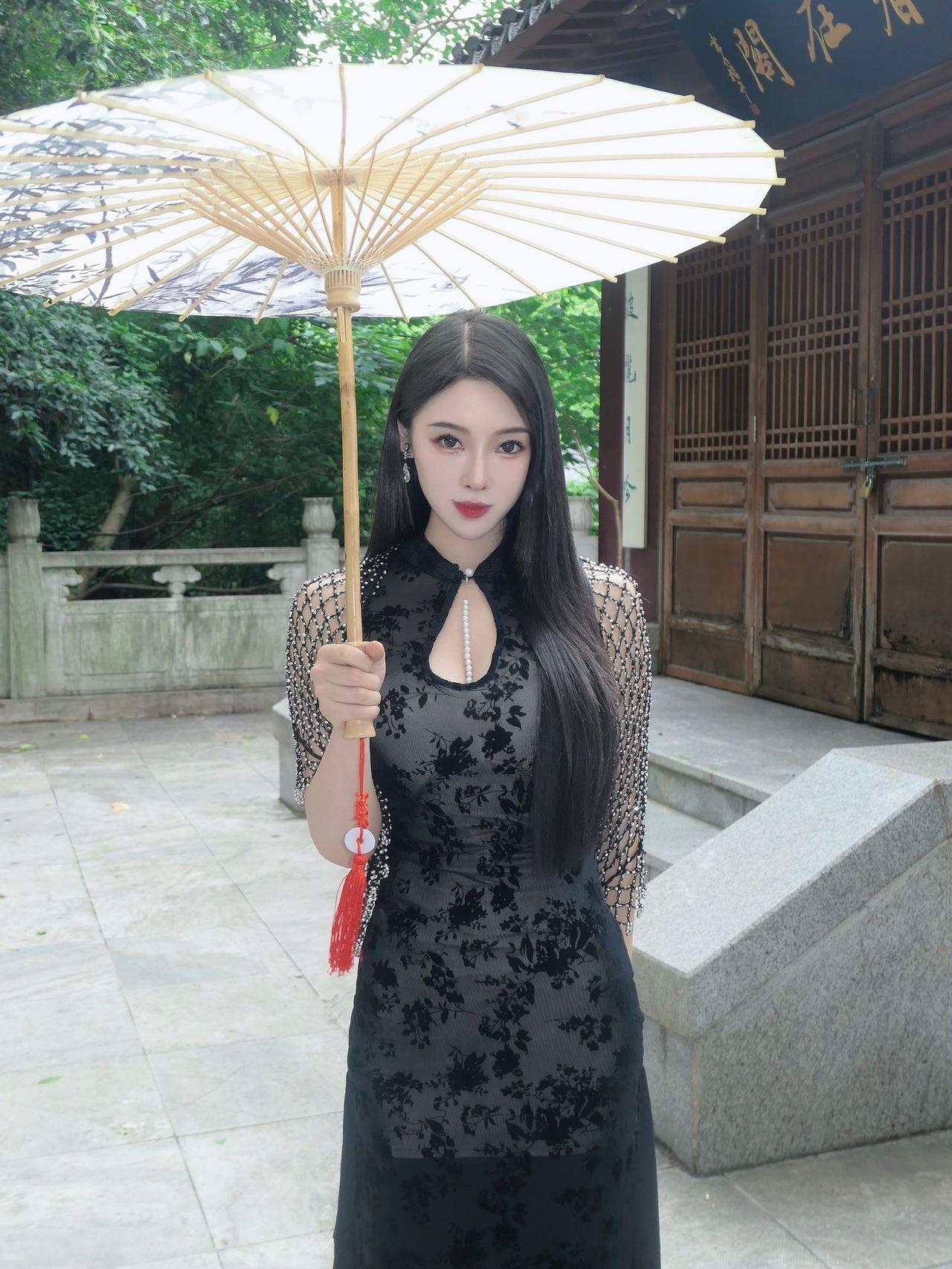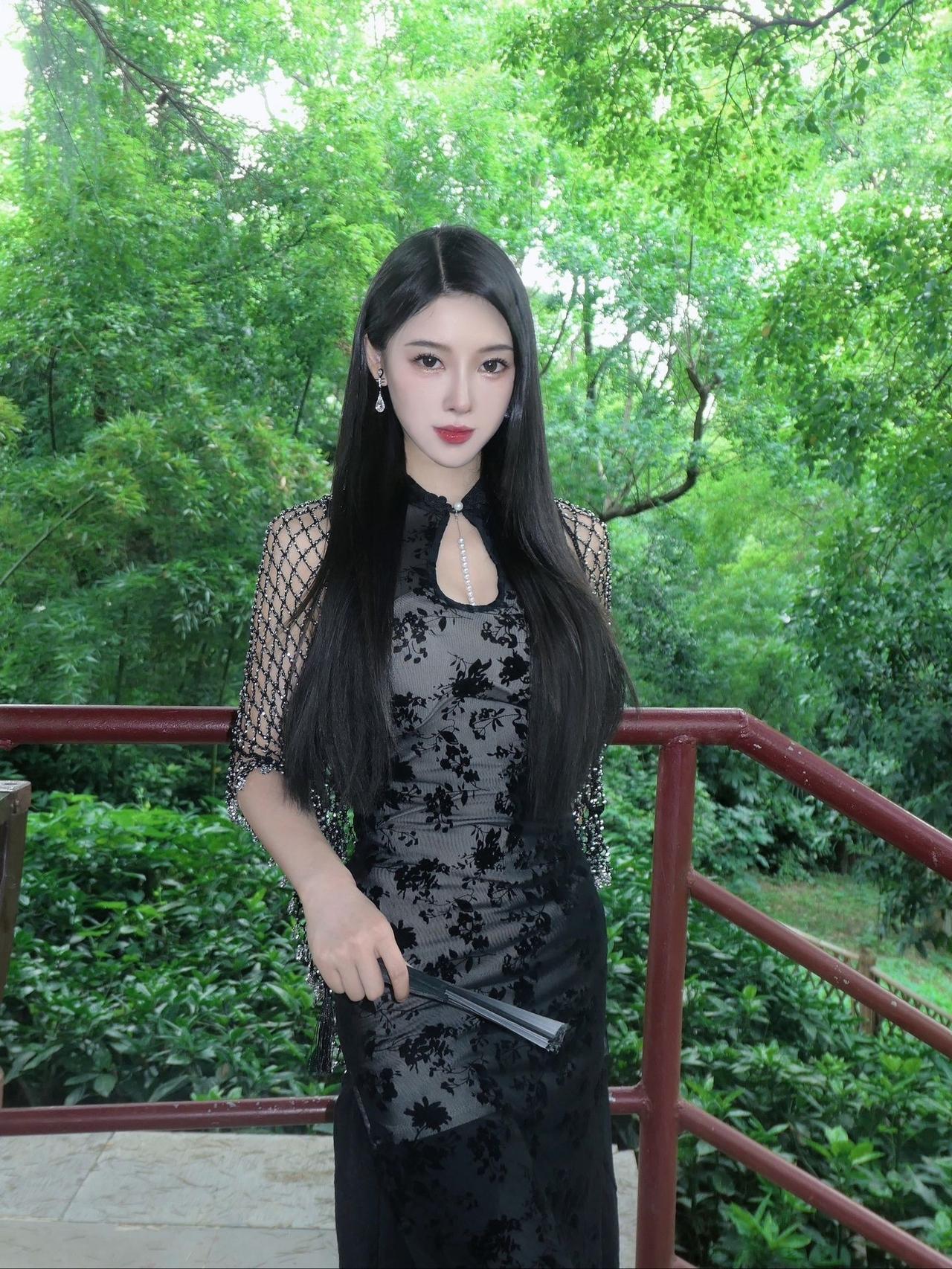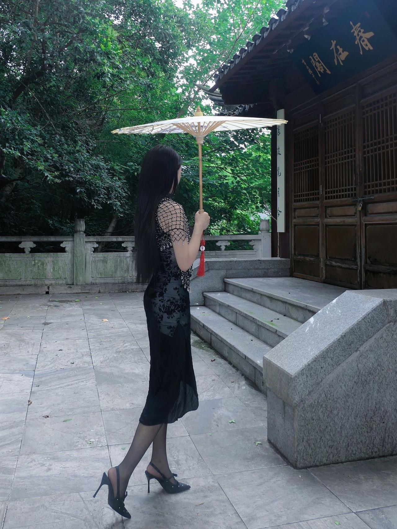 复古园林里的摩登女郎,黑色丝绒旗袍配钻饰披肩,美到失语紫色旗袍