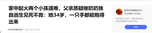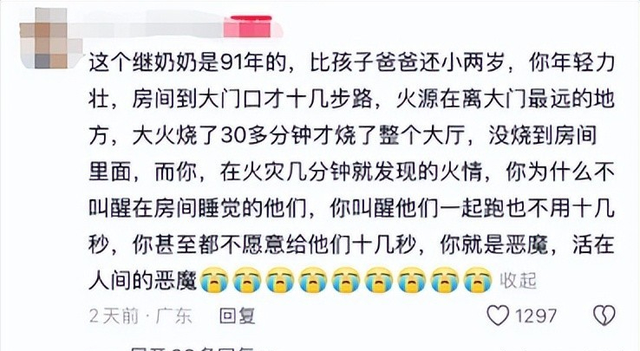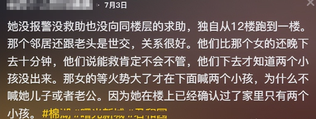 继奶显然是在第一时间发生了火情,但是她竟然没有叫醒并且带着2个孩子逃生,而是独自一个人从12楼跑到了1楼。